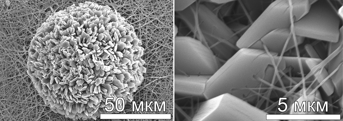 Частицы Ni-МОКС оказываются зафиксированными между нановолокнами (рис. 4б) и не перекрывают поры мембраны. На поверхности носителя ТМ + Хитозан сферические конгломераты Ni-МОКС отчетливо проявляются после 2 ч синтеза (рис. 5а). С увеличением времени синтеза увеличивается средний диаметр конгломератов (⁓15 мкм для 2 ч и ⁓25 мкм для 24 ч), которые в дальнейшем объединяются между собой (рис. 5б). Синтез в течение 48 ч приводит к отслаиванию Ni-МОКС от носителя (рис. 5в). При меньшем времени синтеза данный эффект не наблюдается.