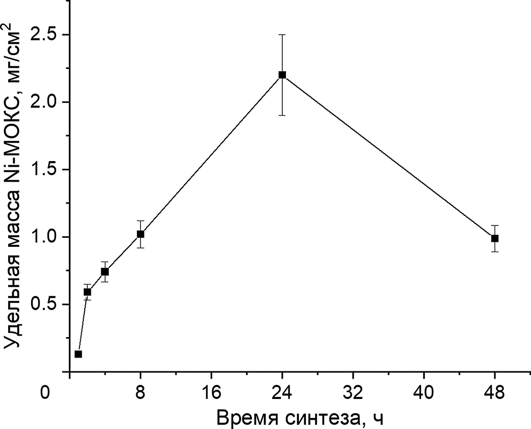 Зависимость удельной массы Ni-МОКС в образцах ТМ + Хитозан + Ni-МОКС от времени синтеза представлена на рис. 6. Максимум наблюдается при 24 ч синтеза, после следует снижение (⁓50%) удельной массы Ni-МОКС. Это может быть связано с отслаиванием соединения от поверхности носителя, что согласуется с данными РЭМ (рис. 5в). Таким образом, установлено, что оптимальным временем синтеза Ni-МОКС на носителе ТМ + Хитозан является 24 ч.