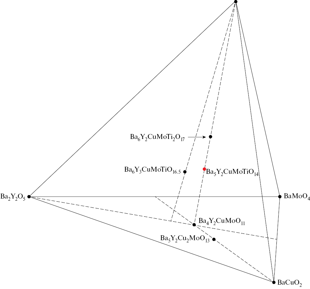На рис. 2 представлено положение фигуративных точек для синтезированных образцов Ba4Y2CuMoO11, Ba5Y2Cu2MoO13, Ba6Y3CuMoTiO16.5, Ba5Y2CuMoTiO14 и Ba6Y2CuMoTi2O17 в концентрационном тетраэдре Ba2Y2O5–BaCuO2–BaMoO4–BaTiO3.