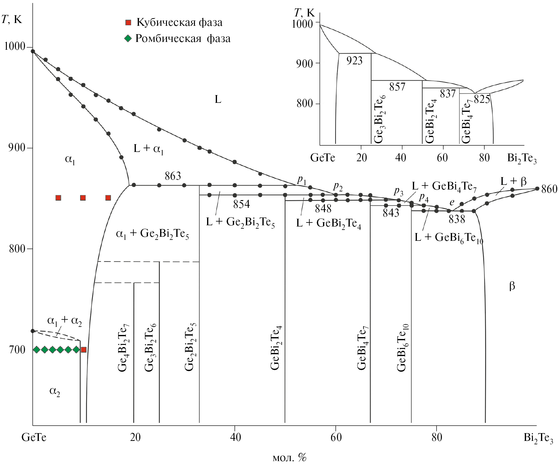 Рис. 1. Фазовая диаграмма системы GeTe–Bi2Te3 [46]. В верхнем правом углу приведена Т-х-диаграмма по данным [32]