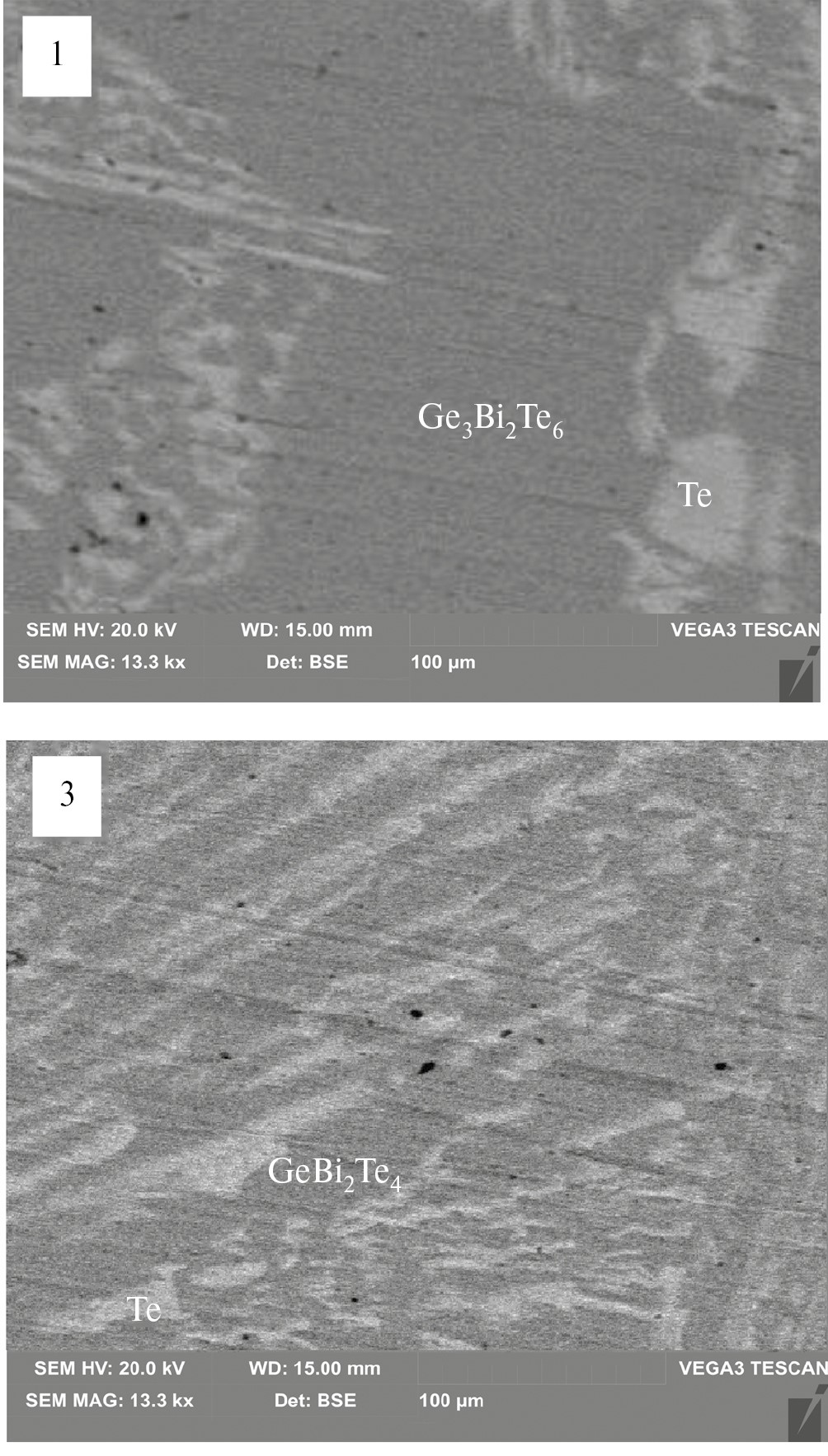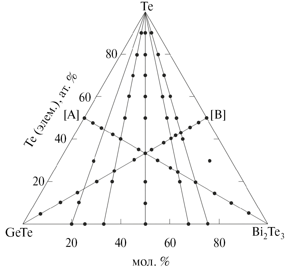 Синтез сплавов проводили в два этапа. Сначала сплавлением элементарных германия (CAS 7440–56–4), висмута (CAS 7440–69–9) и теллура (CAS 13494–80–9) высокой степени чистоты в вакуумированных до давления ~10–2 Па кварцевых ампулах синтезировали бинарные соединения GeTe и Bi2Te3 и идентифицировали их методами дифференциального термического и рентгенофазового анализа. Затем сплавлением этих соединений и элементарного теллура в различных соотношениях также в вакуумированных кварцевых ампулах получали сплавы системы GeTe–Bi2Te3–Те.