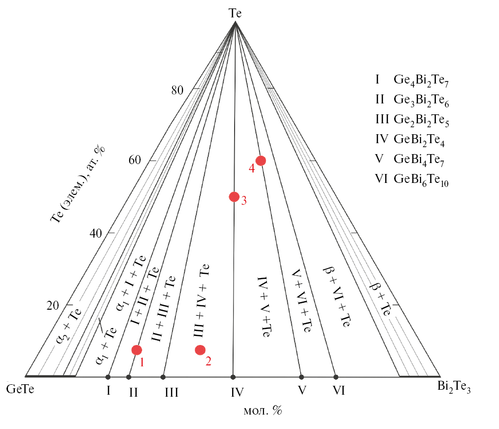 Ниже в тексте, на рисунках и в таблицах приняты следующие обозначения фаз: α1 и α2 – твердые растворы на основе высокотемпературной и низкотемпературной модификаций GeTe, β – твердые растворы на основе Bi2Te3, I–VI – тройные соединения Ge4Bi2Te7, Ge3Bi2Te6, Ge2Bi2Te5, GeBi2Te4, GeBi4Te7 и GeBi6Te10 соответственно (рис. 3).