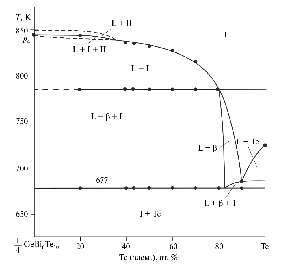 Согласно нашим данным (рис. 6), на всех кривых, исходящих из перитектических (р1–р4) и эвтектической (е1) точек боковой системы GeTe–Bi2Te3, в определенных переходных точках (K1–K5) происходит трансформация типов моновариантных равновесий.