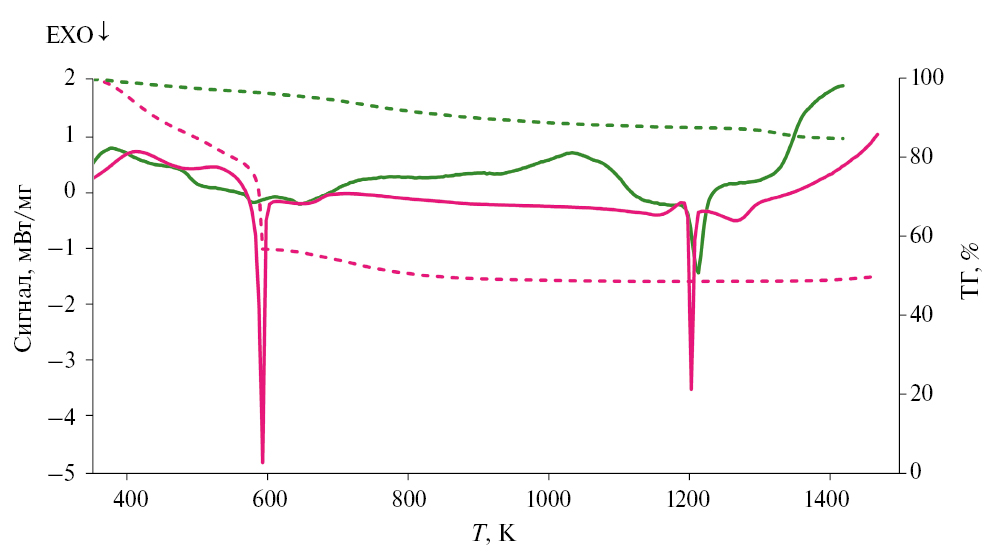 Рис. 2. СТА-кривые образцов шихты Er0.5Y0.5AG из гидрозоля состава Al5(NO3)3(OH)12 ∙ 3Y(OH)2(OOCCH3): зеленые линии соответствуют одностадийному распылительному варианту синтеза ультрадисперсной шихты при 675 K, розовые линии отвечают шихте, полученной высушиванием бинарного гидрозоля при 425 K в сушильном шкафу с последующим диспергированием в планетарной мельнице