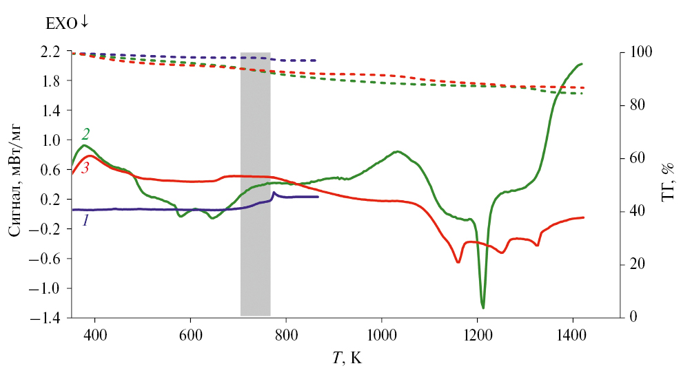 Рис. 4. Сравнение СТА-кривых синтезированных в одинаковых условиях трех вариантов ультрадисперсной шихты: 1 – стекла 0.2Bi2O3–0.6B2O3–0.2BaO (рис. 1), 2 – ксерогеля Er0.5Y0.5AG (рис. 2) и 3 – шихтового прекурсора, изначально объединяющего все компоненты стеклокерамики 0.46(0.2Bi2O3–0.6B2O3–0.2BaO)–0.54Er:YAG. Серым цветом выделен температурный интервал расстекловывания для кривых 1 и 3