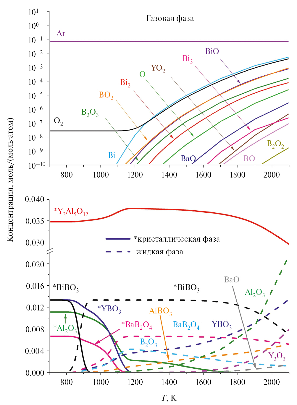 Качественный состав конденсированной фазы (твердое и жидкое состояния) | Y3Al5O12 [34], Y2O3, YBO3 [31], Bi2O3, Al2O3, BaO, B2O3, AlBO3 [35], Al5BO9 [36], Al4B2O9 [37], Ba2B6O11 [38], BaB2O4 [39], BiBO3 [40], Bi4B2O9 [41] |