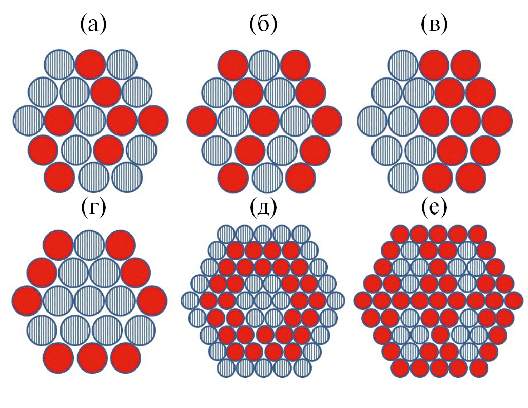 В обзорной статье [23] авторы дополнительно к представленным выше группам сплавов добавляют многослойные сплавные структуры core-shell (рис. 2д, 2е).
