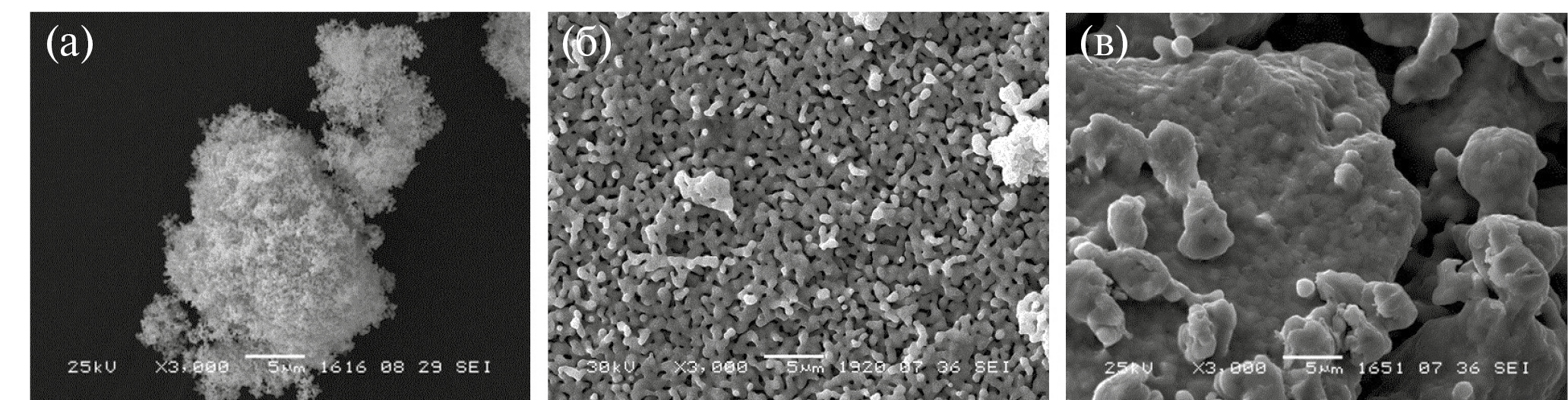 Рис. 3. СЭМ-микрофотографииинтер дисперсных сплавов Ni1–xPdx (5 вес. % Pd), полученных при температурах синтеза 400 (а), 600 (б), 800°С (в) [29]