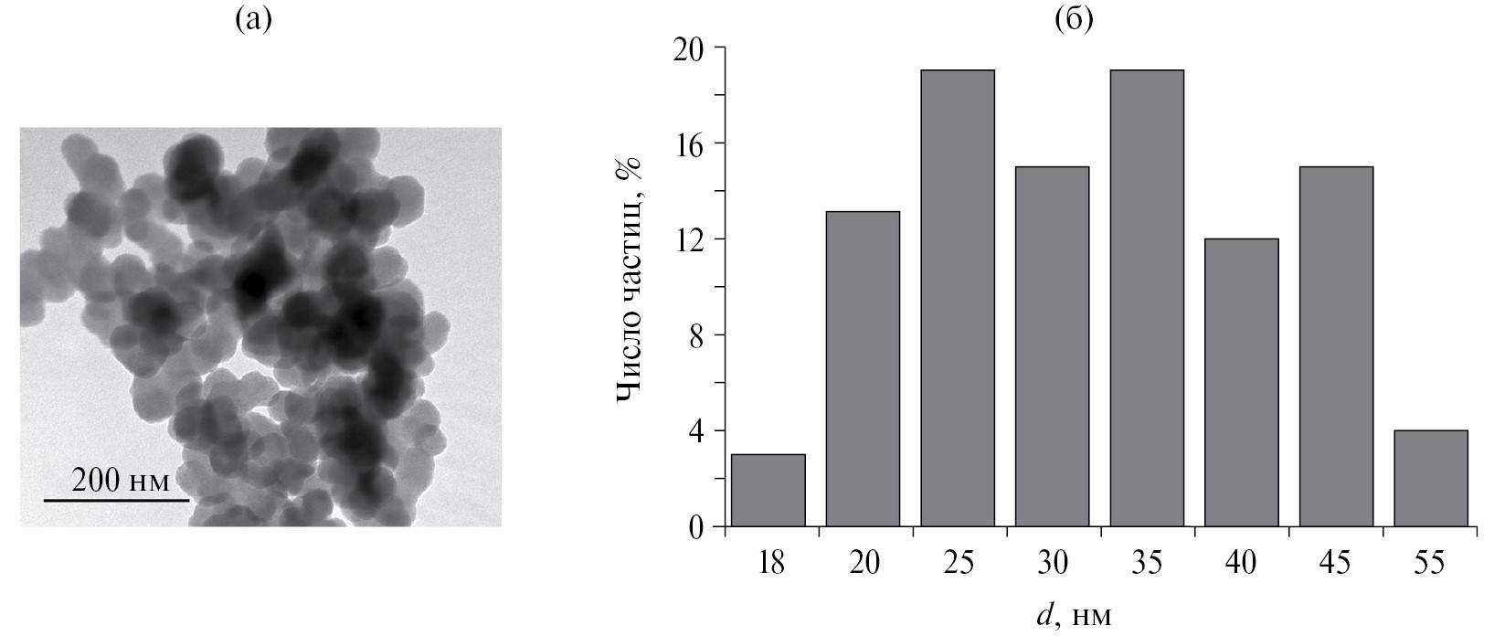 Высушенный осадок исследован с помощью просвечивающей электронной микроскопии, на рис. 6а показана микрофотография частиц, а на рис. 6б – гистограмма распределения по размерам. Получены наночастицы сферической формы со средним диаметром 34 ± 9 нм.