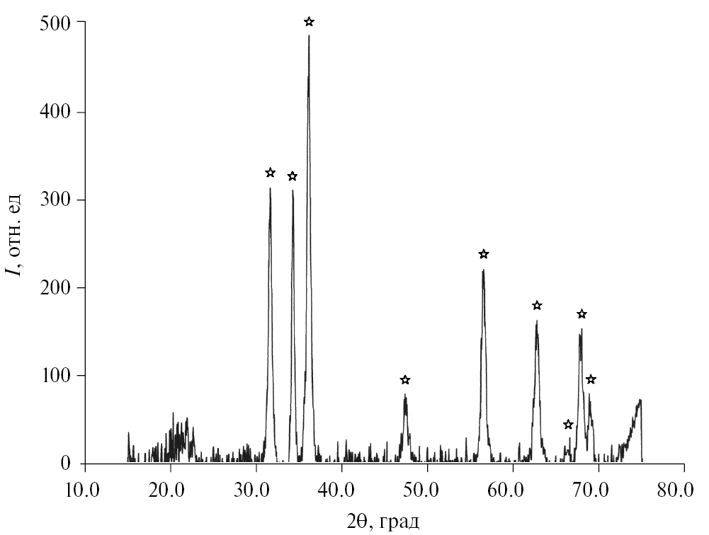 Для определения кристаллической структуры и состава наночастиц была получена дифрактограмма образца (рис. 7). Сравнение с дифрактограммой ZnO свидетельствует о том, что действительно синтезированы наночастицы оксида цинка; характерные для ZnO пики на дифрактограмме отмечены звездочками.