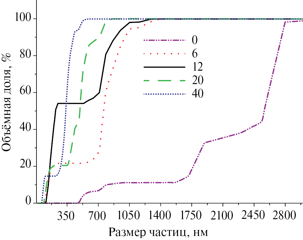 Рис. 1. Влияние времени размола (0, 6, 12, 20 и 40 ч) на интегральные кривые объемного распределения частиц по размерам для CVD-порошков ZnSe.