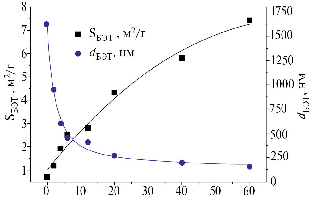 На рис. 2 приведены данные измерений SБЭТ и dБЭТ порошков. Режим размола 60 ч обеспечил десятикратное уменьшение dБЭТ от 1630 до 150 нм. В начале размола SБЭТ ожидаемо возрастает быстрее, чем при дальнейшей обработке (после разрушения крупных агломератов). Например, после 20 ч обработки размер частиц уменьшается в 6.5 раз до уровня 250 нм, а за последующие 20 ч − только в 1.7 раза.