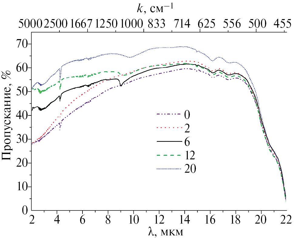 С увеличением времени размола пропускание керамик ZnSe в средней ИК-области постепенно повышается и достигает максимального уровня при использовании 20-часовой обработки. Максимум прозрачности (69% при теоретическом 70%) для образца 20 соответствует длине волны 14.00 мкм. Оптическое пропускание постепенно снижается при смещении в область меньших длин волн и на длине волны генерации Fe2+ : ZnSe лазера (4.50 мкм) составляет 61%. Дальнейшее увеличение времени размола приводит к получению практически непрозрачных керамик ZnSe (образцы 40 и 60).