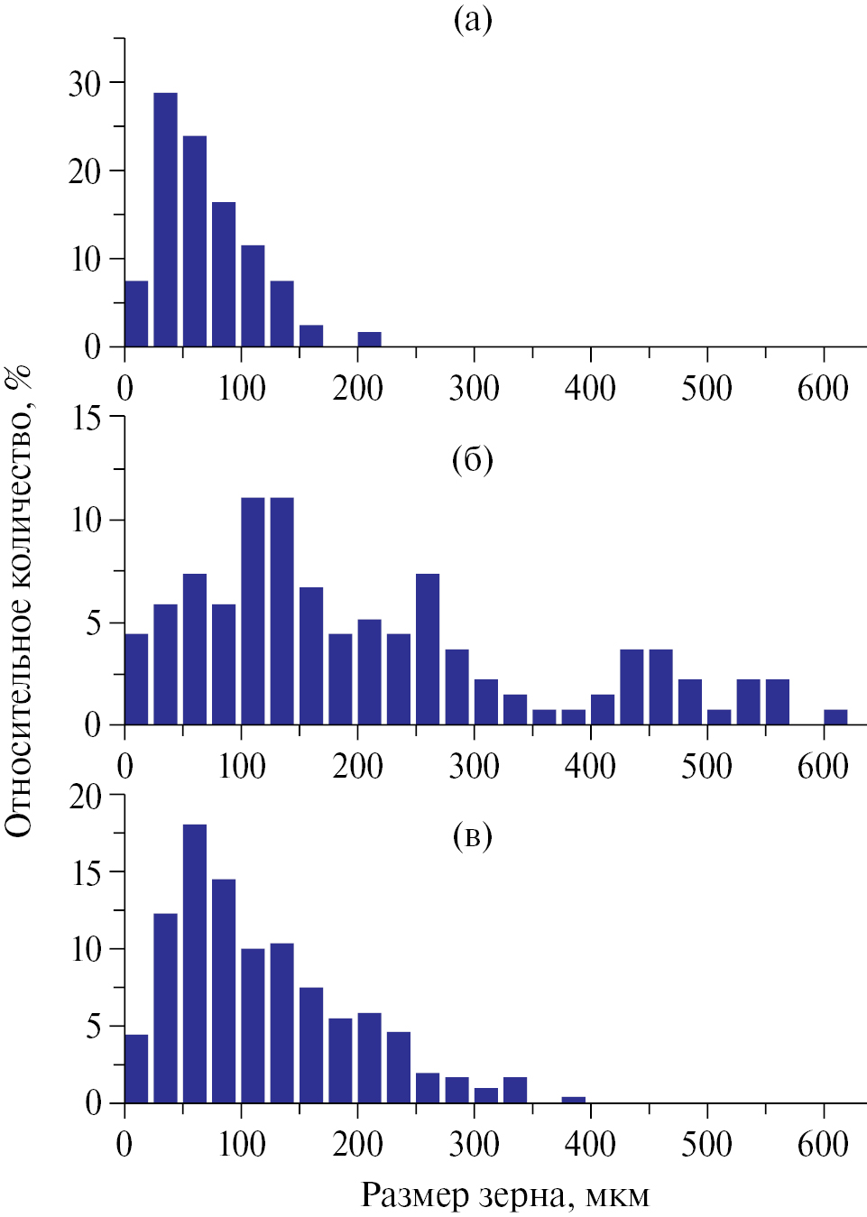 Рис. 7. Гистограммы распределения зерен по размерам для керамик ZnSe: образцы 0 (а), 12 (б), 20 (в).