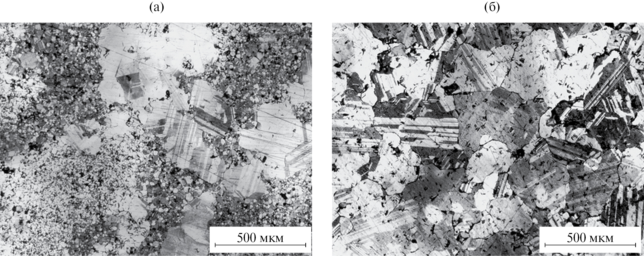 * Наблюдается вторичная рекристаллизация, средний размер зерна зависит от выбранной области исследования. Представлены данные для характерных зон с мелкозернистой и крупнозернистой структурами соответственно.