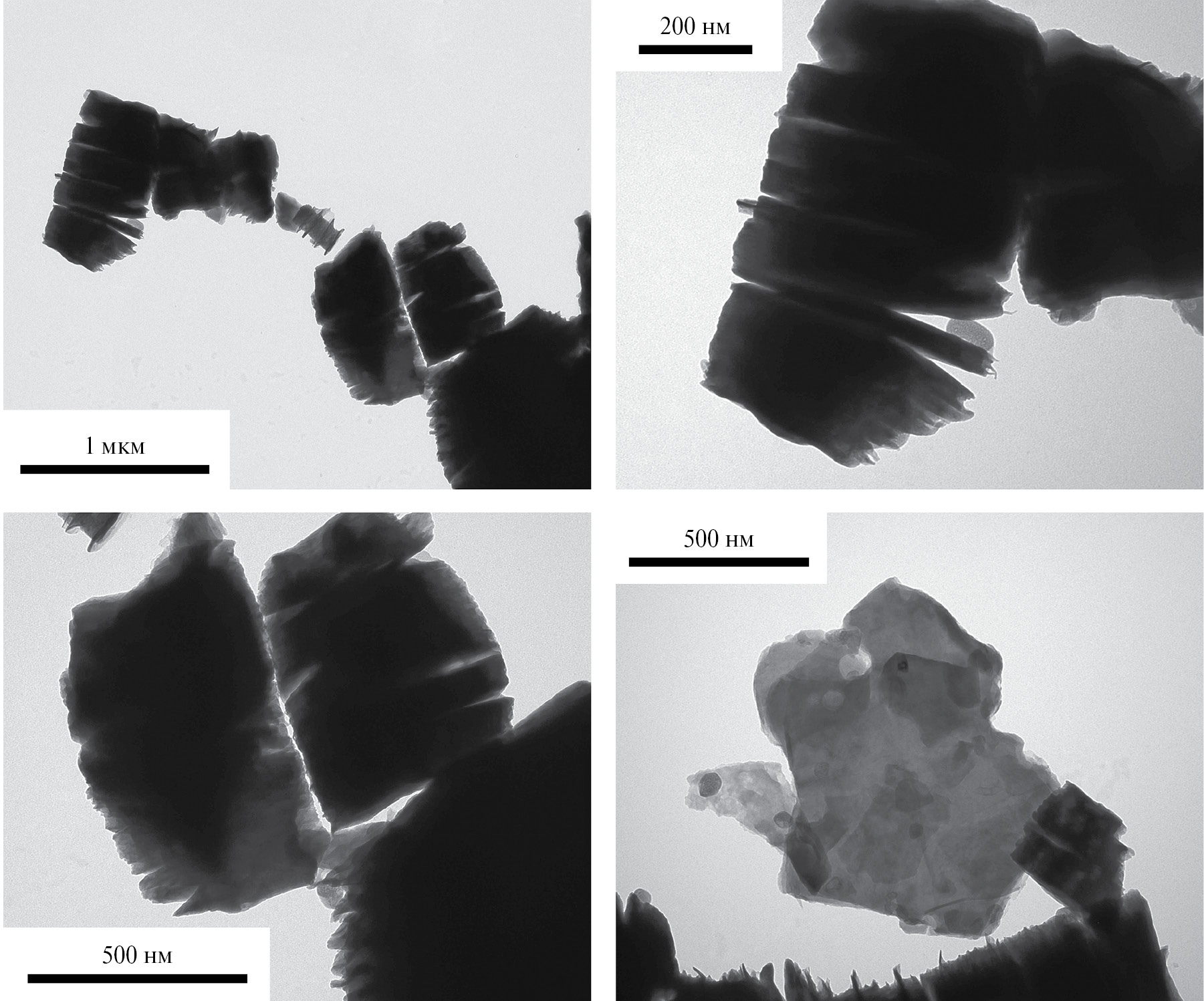 Как видно из рис. 1, агрегаты аккордеоноподобного максена Ti2CTx имеют достаточно широкий интервал размеров: диаметр стопок слоев варьирует от 120 нм до ~1.2 мкм, толщина – от 300 нм до ~2 мкм. При этом на основании анализа микроструктуры встречающихся малослойных частиц можно сделать вывод, что отдельные слои максенов имеют дефекты в виде круглых отверстий, вероятно, унаследованных от структуры исходной МАХ-фазы.