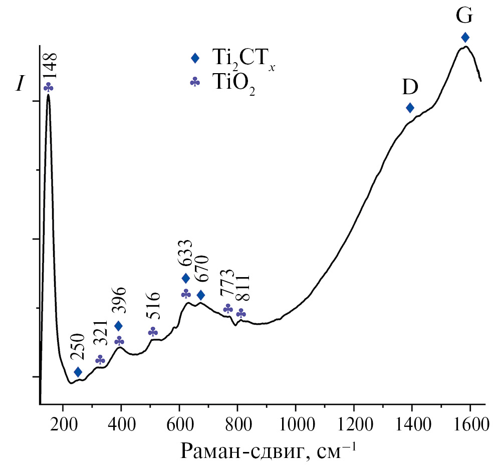 Раман-спектры регистрировали на спектрометре комбинационного рассеяния SOL Instruments Confotec NR500 (объектив 20, лазер 532 нм). Во избежание окислительных процессов, характерных для максенов при локальном повышении температуры под действием лазера, мощность на образцах не превышала 2 мВт. Решетка 600, время накопления сигнала 25 с.