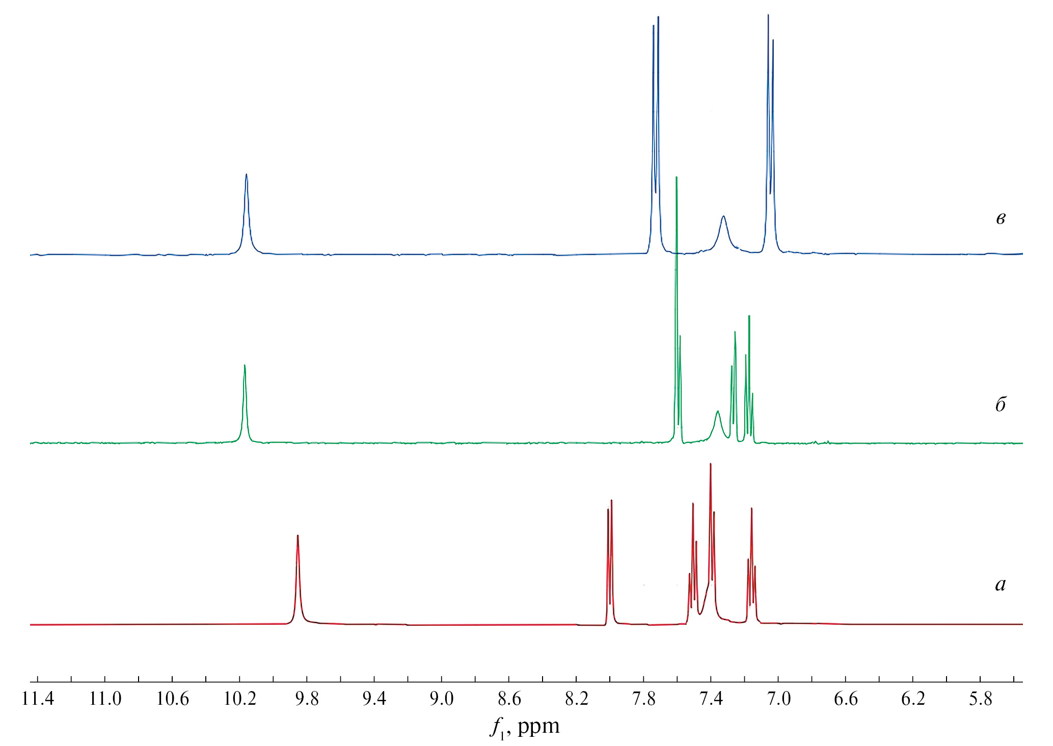 Строение полученного продукта определяли с помощью мультиядерной ЯМР- и ИК-спектроскопии, ESI-масс-спектрометрии высокого разрешения. В спектрах 1H ЯМР амидинов наблюдаются сигналы ароматических протонов дизамещенных фенильных колец (рис. 2). При этом вид спектров и мультиплетность сигналов характерны для орто-, мета- и пара-изомеров. Амидиновый фрагмент представлен двумя уширенными синглетами в области 10.2–9.8 и 7.4–7.5 м.д.
