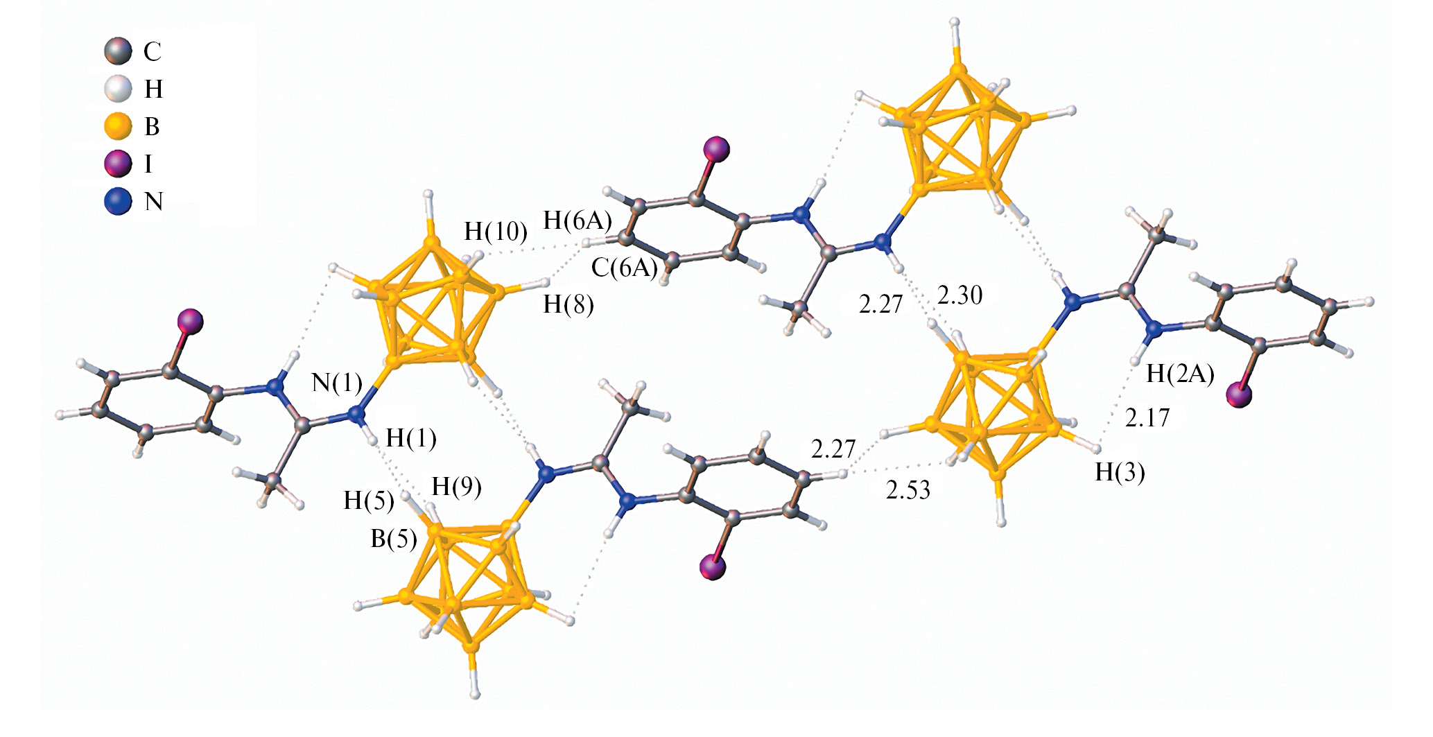 В структуре наблюдаются два типа нековалентных межмолекулярных взаимодействий (рис. 4). Диводородные связи между иминным протоном и атомами водорода соседнего кластера N(1)H(1)…H′(5)B′(5) и N(1)H(1)…H′(9)B′(9) (длины связей 2.27 и 2.30 Å соответственно) объединяют анионы в центросимметричные димеры. Межмолекулярные связи между атомом водорода фенильного кольца и атомами водорода кластерного остова С(6A)H(6A)…H′(8)B′(8) и С(6A)H(6A)…H′(10)B′(10) (длины связей 2.27 и 2.53 Å соответственно) отвечают за образование полимерных цепочек из анионов.