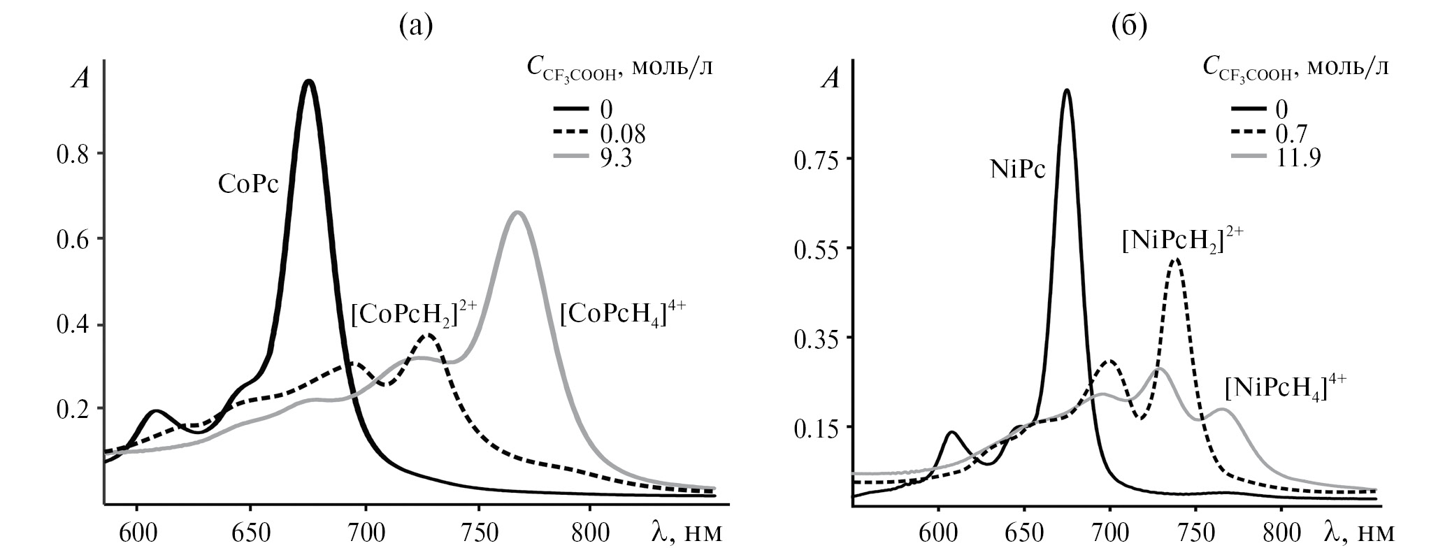 Протонирование CoPc(3,5-di-tBuPh)8 и NiPc(3,5-di-tBuPh)8 в CF3COOH–CH2Cl2 протекает с той же стехиометрией (рис. 3) с образованием двух протонированных форм, спектральные кривые и положение длинноволновых полос для которых представлены соответственно на рис. 4 и в табл. 2. Спектры дважды протонированных форм CoPc(3,5-di-tBuPh)8 и NiPc(3,5-di-tBuPh)8 содержат расщепленную Q-полосу с максимумами при 699, 728 нм и 700, 738 нм соответственно. Для NiPc(3,5-di-tBuPh)8 концентрация CF3COOH, необходимая для осуществления протонирования как на первой, так и на второй стадии, гораздо выше. В случае NiPc(3,5-di-tBuPhO)8 допустимый интервал концентраций СCF3COOH = 0.7–11.9 моль/л (концентрация чистой кислоты 12.93 моль/л) не позволяет достичь полного перехода к четырежды протонированной форме (рис. 4). Однако полоса при 766 нм, соответствующая четырежды протонированной форме, уже появляется.