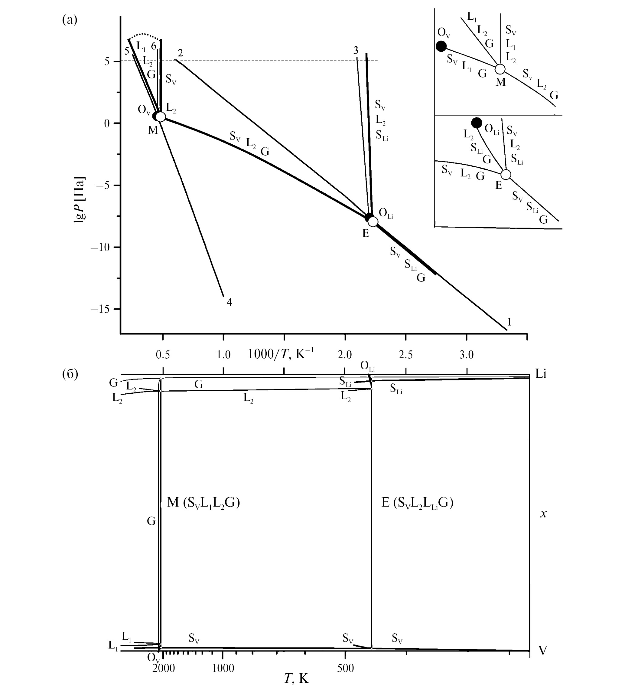 В системе Li–V отсутствуют интерметаллиды и твердые растворы на основе Li (Imm) и V (Imm), образуется вырожденная эвтектика на основе лития, а расплавы Li и V не смешиваются [16]. Равновесные диаграммы T–x (температура–состав) для Li–V при собственном давлении P насыщенного пара (Li, Li2, V [17]) и избыточном давлении P = 1 атм (101 кПа), представленные в работе [16], можно рассматривать как T–x-проекцию без линии пара и T–x-изобарное сечение P–T–x-фазовой диаграммы Li–V. Модели P–T- и T–x-проекций (рис. 1) позволяют корректировать изобарические T–x-диаграммы (рис. 2). Координаты тройной точки Li (OLi, рис. 1а) определены с высокой точностью (453.7 K, 2.3 × 10–8 Па) [17]. Температура кипения (P = 101.325 кПа) литиевого расплава находится в интервале 1600–1620 K [18]. Давлению пара Li при сублимации (298–454 K [19]) и испарении (455–1500 K [20], 700–2075 K [21]) на P–T-проекции (рис. 1а) соответствуют линии 1 и 2. Увеличение температуры плавления Li с ростом давления [22] представлено линией 3. Тройная точка (2201 K, 3.64 Па), температура кипения (3694 K) и линия сублимации 4 (298–2201 K) для V приведены на P–T- и T–x-проекциях (рис. 1а, 1б, OV) по данным [23]. Линия испарения 5 построена на основе данных работы [21], в которой область аппроксимации 1800–4375 K включает интервал 2201–3700 K для [23]. Плавление V представлено вертикалью 6, поскольку экспериментально зависимость температуры плавления от давления не установлена. Эвтектическому E (SVL2SLiG) и монотектическому M (SVL1L2G) равновесиям (SV, SLi, L1, L2 – кристаллические фазы и расплавы на основе ванадия и лития; G – пар) на P–T-проекции отвечают точки E и М, а на T–x-проекции – четыре точки составов фаз в нонвариантных равновесиях, объединенные нодой (рис. 1б). Вырожденные моновариантные линии L2SLiG и SVL1G связывают на P–T-проекции нонвариантные точки E и М с тройными точками OLi и OV, чему на T–x-проекции соответствуют пучки из трех линий состава, объединяющие ноды с тройными точками. Моновариантное равновесие SVL2G объединяет два нонвариантных равновесия. Линия совместной сублимации SVSLiG на P–T-проекции (линии солидуса и пара на T–x-проекции, уходящие вниз) практически совпадает с линией 1 сублимации лития, а линия L1L2G (на T–x-проекции линии ликвидуса и пара, уходящие вверх) практически совпадает с линией 5 испарения ванадия. Кроме того, присутствуют моноварианты совместного плавления ванадия с литием SVL2SL и плавления ванадия с расслаиванием SVL1L2. Для пояснения P–T–x-диаграммы и сравнения с результатами работы [16] на рис. 2а, 2б приведены модели изобарных T–x-сечений для интервала POLi < P < PM и при давлении 101 кПа. Диаграмма без учета паровой фазы с температурами вырожденной эвтектики 453.7 K и монотектики 2183 K [16] соответствует T–x-сечению при давлении 101 кПа (рис. 2), но диаграмму для 101 кПа, приведенную в [16], нельзя назвать корректной. Давление пара в тройной точке ванадия и над расплавом лития при 615 K (342°C) значительно ниже 101 кПа, и равновесие ванадий–пар SVG при 101 кПа не может реализоваться [16].
