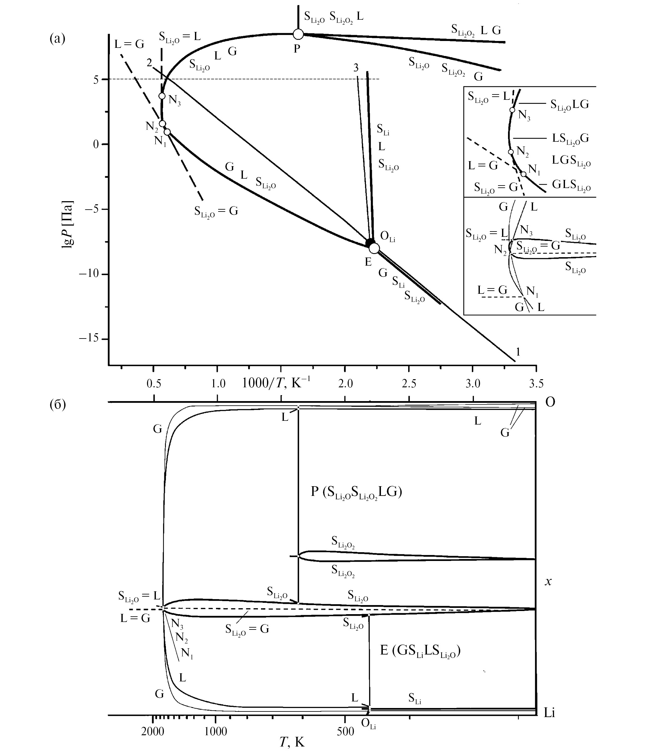 В системе Li–O существуют стабильные оксиды Li2O (Fmm) и Li2O2 (P63/mmc). Кристаллическая фаза Li2O конгруэнтно плавится, образует вырожденную эвтектику с литием и появляется при перитектическом плавлении Li2O2 [24]. Расплав Li2O конгруэнтно испаряется [24]. В паре присутствуют Li, Li2, O2, Li2O, LiO, Li3O и Li2O2 [17]. О конгруэнтной сублимации Li2O свидетельствует наличие линии минимального давления для кристаллического Li2O [17] по отношению к линиям моновариантных равновесий SLiSLi2OG и SLi2OSLi2O2G (SLi2O и SLi2O2 – кристаллические фазы на основе Li2O и Li2O2) [25]. Экспериментальные данные по давлению пара над Li [19–21], Li2O [17] и Li2O2 [17] позволяют смоделировать P–T-диаграмму и при использовании изобарной T–x-диаграммы (101 кПа) [24] представить в виде проекций и изобарных сечений P–T–x-фазовую диаграмму системы Li–O (рис. 3 и 4). Координаты тройной точки OLi и точки кипения при 101 кПа, линии сублимации 1, испарения 2 и плавления 3 для Li на P–T-проекции (рис. 3а) такие же, как на рис. 1а. Тройная точка кислорода (54.36 K, 146 Па) [26] не отмечена. Эвтектическому E (GSLiLSLi2O) и перитектическому P (SLi2OSLi2O2LG) равновесиям на P–T-проекции соответствуют точки E и P. Кроме того, присутствуют точки условно нонвариантных равновесий N1, N2 и N3, в которых линии конгруэнтного испарения L = G, сублимации SLi2O = G и плавления SLi2O = L касаются трехфазной моноварианты GLSLi2O, в результате чего последовательно изменяется порядок фаз GLSLi2O → LGSLi2O → LSLi2OG → SLi2OLG (рис. 3а и поясняющая вырезка). На T–x-проекции линия пара G, обогащенного литием, пересекается с линиями ликвидуса L и солидуса SLi2O, которые после прохождения через температурный максимум пересекаются между собой, и из точек пересечения линий составов исходят штриховые линии конгруэнтных превращений (рис. 3б и вырезка). Как и на рис. 1, четыре точки составов фаз в нонвариантных равновесиях E и P объединены нодами (рис. 3 б), и вырожденная моновариантная линии GSLiL связывает на P–T-проекции нонвариантную точку E с тройной точкой OLi (рис. 3а), чему на T–x-проекции соответствует пучок из трех линий состава, объединяющий ноду с тройной точкой. Моновариантное равновесие GLSLi2O (SLi2OLG) объединяет нонвариантные равновесия E (GSLiLSLi2O) и P (SLi2OSLi2O2LG). Линия совместной сублимации GSLiSLi2O на P–T-проекции (линии солидуса и пара на T–x-проекции, уходящие вниз) практически совпадает с линией 1 сублимации лития. Область дивариантного равновесия SLi2O2–кислород заключена на P–T-проекции между моновариантами SLi2OSLi2O2G и SLi2O2LG, а на T–x-проекции представлена двумя линиями солидуса и двумя линиям пара, отходящими вниз от ноды P (SLi2OSLi2O2LG). На рис. 3 также отмечены моноварианты совместного плавления оксида лития с литием SLiLSLi2O и с пероксидом SLi2OSLi2O2L при изменении давления.