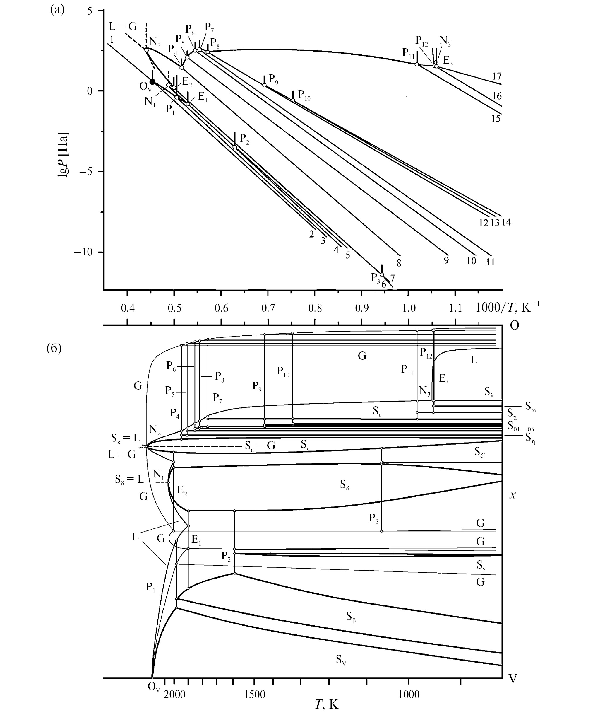 OV – тройная точка ванадия, E1–E3 – эвтектики, P1–P12 – перитектики, N1–N3 – условно нонвариантные точки, соединенные линиями моновариантных равновесий. Эвтектическим и перитектическим равновесиям на T-проекции (рис. 5б) соответствуют ноды, связывающие составы четырех фаз. Моновариантные трехфазные равновесия на T–x-проекции представлены тремя линиями составов (линии наибольшей толщины S – солидус или сольвус, средние L – ликвидус, тонкие G – пар). Линии, отвечающие равновесиям между конденсированными фазами SSL или SSS, выходящие из нонвариантных точек E и P, для упрощения P–T–x-фазовой диаграммы не приведены. Моновариантные равновесия с участием пара указаны в табл. 1. Штриховые линии, касающиеся моновариант на P–T-проекции (рис. 5а) или пересечений линий состава на T–x-проекции (рис. 5б) в точках N1 (~2050 K [31]) и N3 (~955 K [31]) отвечают конгруэнтному плавлению Sδ (VO) и Sλ (V2O5). Точка N2 (~2265 K [31]) в действительности представляет собой три точки для Sε (V2O3) подобно тому, как это происходит в случае Li2O (рис. 3), из которых исходят линии конгруэнтного испарения L = G, сублимации Sε = G и плавления Sε = L. В результате на моноварианте, связывающей E2 и P4, происходит изменение порядка фаз GLSε → LGSε → LSεG → SεLG. Парциальное давление кислорода для моновариантных равновесий системы V–O изменяется более чем на сто порядков [31, 32], поэтому приведены моноварианты общего давления, которые из-за противоречивости экспериментальных данных могут быть сдвинуты по давлению на порядок [31–35].