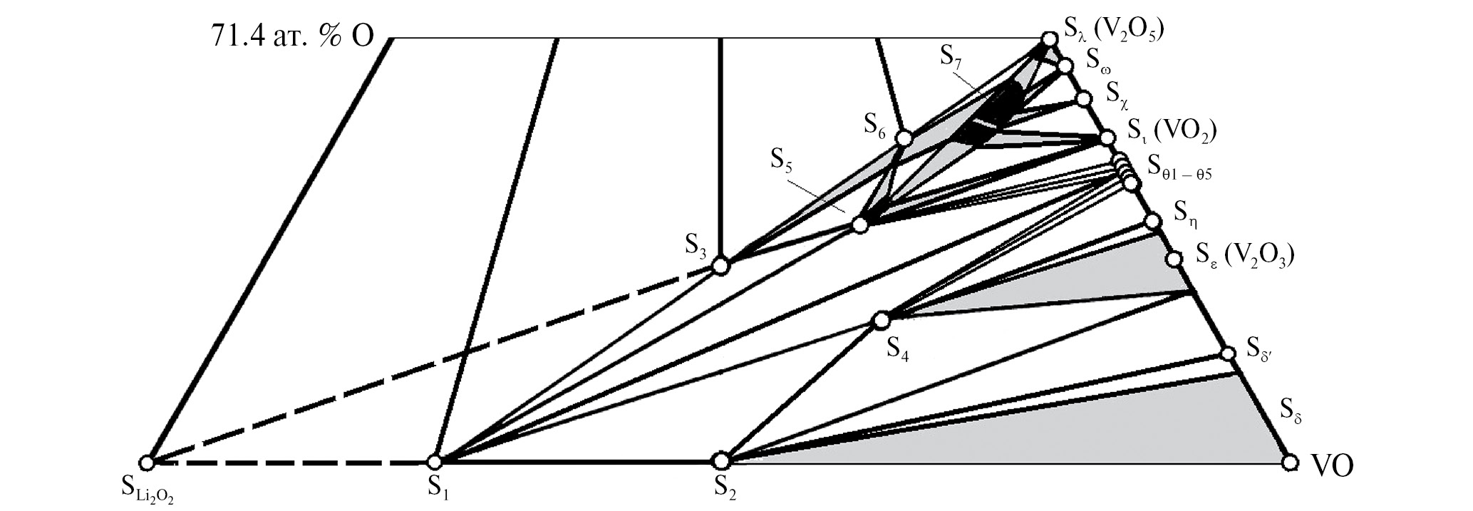 Рис. 7. Фрагмент изотермической концентрационной диаграммы Li–V–O (50 ат. % ≤ O ≤ 71.4 ат. %).