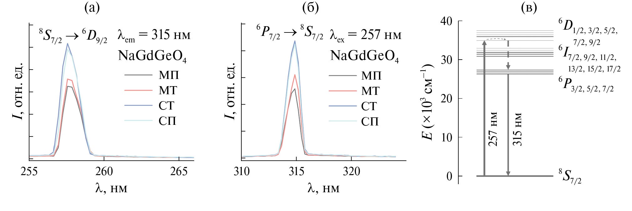 Спектры возбуждения германатов NaGdGeO4, отожженных при различных условиях, регистрировали при λem = 315 нм (рис. 5а). Пик в области 255–260 нм обусловлен 4f–4f-переходом иона Gd3+ из основного состояния 8S7/2 в возбужденное 6D9/2 (рис. 5в). Спектры фотолюминесценции образцов были получены при возбуждении излучением λex = 257 нм. В спектрах (рис. 5б) присутствует линия с максимумом при 315 нм, соответствующая переходу 6Р7/2 → 8S7/2 иона Gd3+.