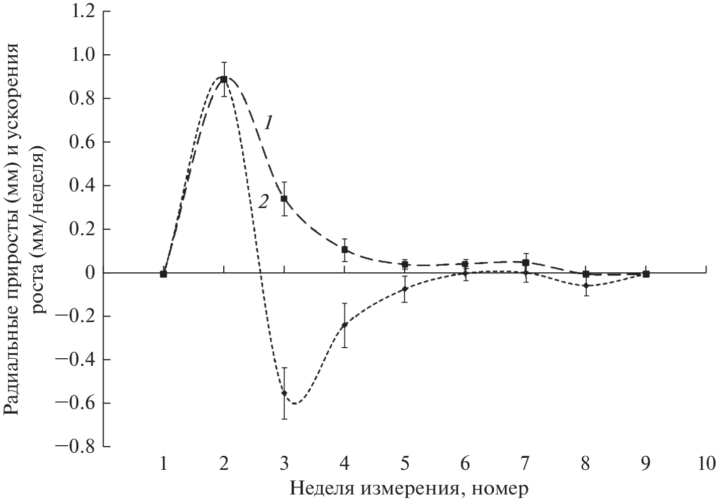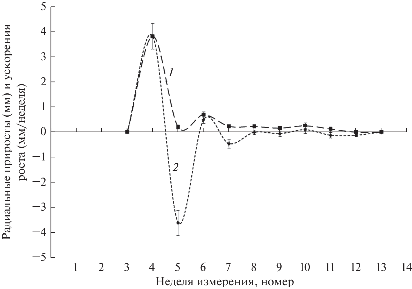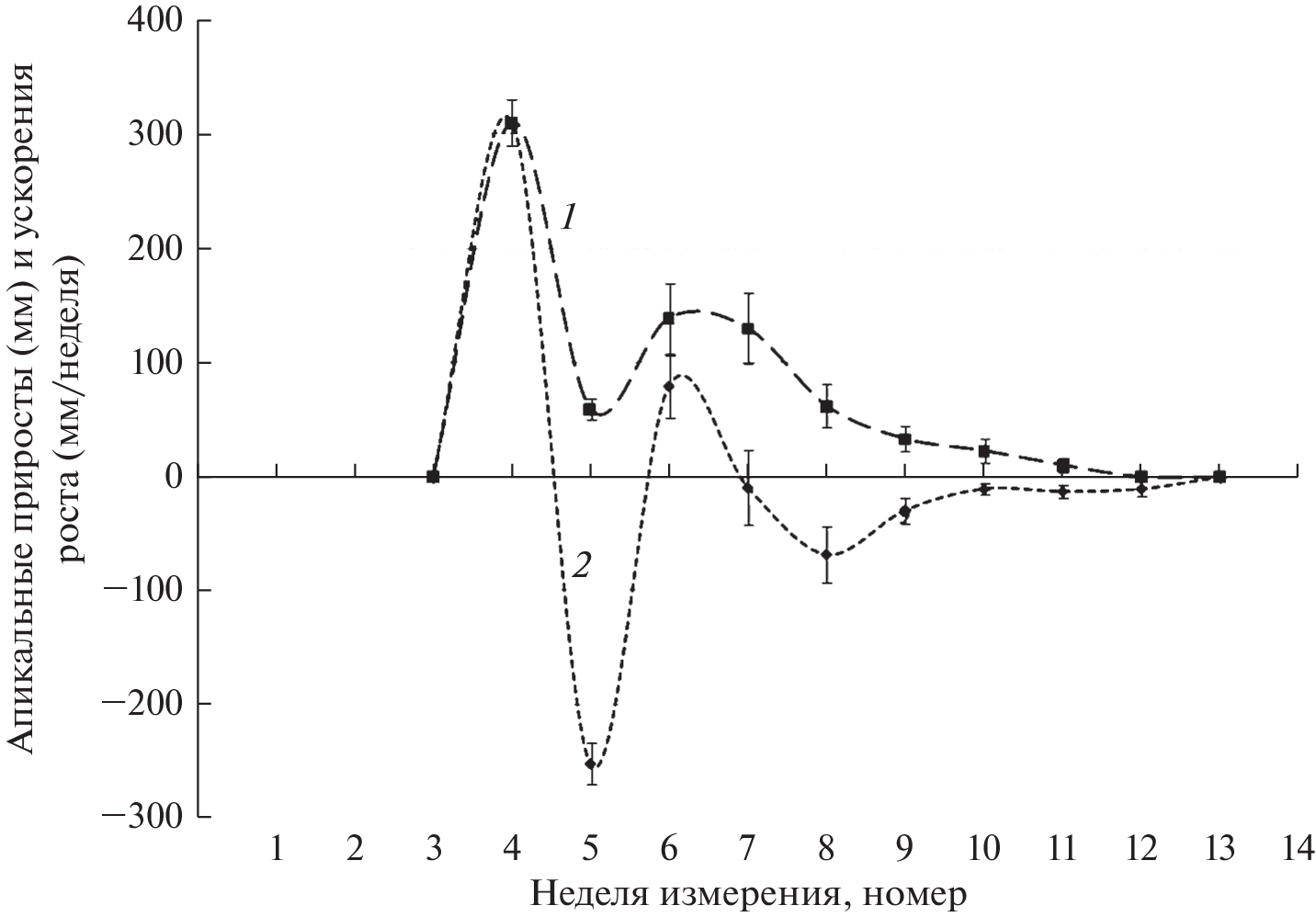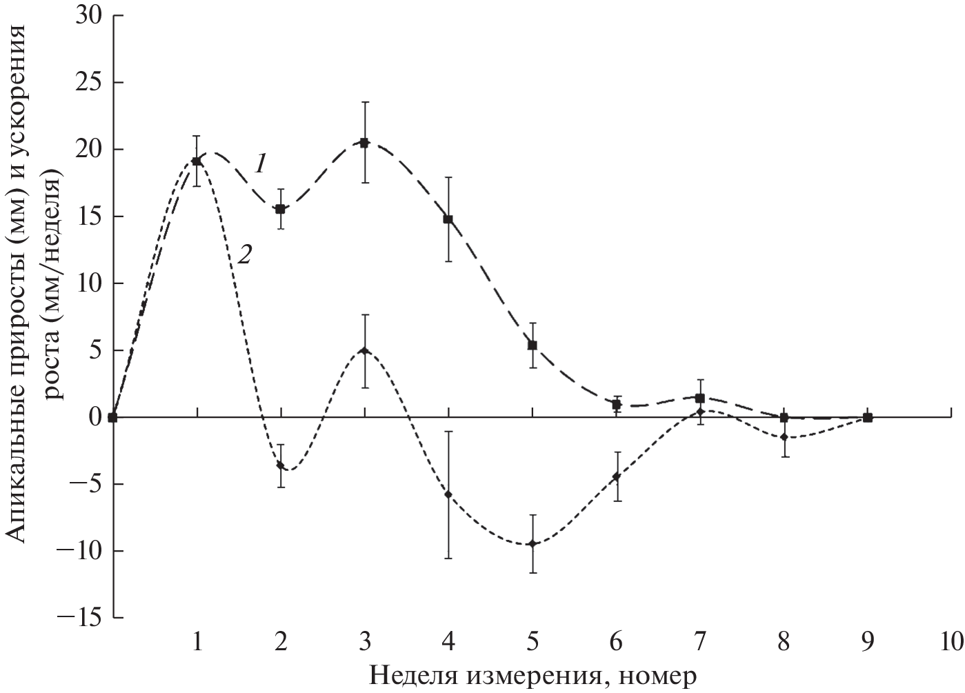 The aim of the study was to establish the type (linear or non-linear) and shape (presence of extremes and trends) of the time dependences of apical and radial growth rates for shoots of two types (branching and formation) in woody plants. The object of the study was an introduced in the Middle Urals ornamental early-flowering shrub species Forsythia ovata Nakai. Seasonal dynamics of morphometric parameters of two types of shoots, which differ in intensity of growth and origin (developing from the apical or dormant buds of the skeletal branch respectively), was examined. Also, there was made an assessment of their relationship with air temperature and precipitation values. Apical and radial growth are accompanied by oscillations of increments. The duration of individual phases of oscillations is about 7 or more days, which makes it possible to attribute this phenomenon to infradian growth rhythms. The weak relationship between the characteristics of the observed oscillations and weather conditions indicates the predominantly endogenous nature of the observed morphogenetic processes. The growth of formation shoots begins 4 weeks later than branching shoots. This delay is apparently related to the time necessary for activation of dormant bud growth. Seasonal dynamics curves of rates and accelerations of the apical and radial shoot’s growth have the shape of previously unobserved oscillations with phases fading in amplitude and changing in duration. The growth ends 1–2 months before the environmental conditions become unfavorable. The oscillations of the growth rate of shoots are apparently associated with the action of two or more differently directed factors, which determine the increase in volume of different segments of the shoot. These factors include the different contribution of cell division and elongation to the change in the geometric dimensions of the apical meristem domains. The main differences in the seasonal dynamics of the apical and radial increments for both types of shoots are: the duration of growth (6–8 and 4 weeks, respectively), the number of extremes, the amplitude and the duration of individual phases of oscillations. Higher amplitudes of the growth rate oscillations in shoots formation compared with branching shoots, cause bigger values of the formation shoots total increments. The dynamic curves of the apical growth rates have two maxima, while those of the radial growth have only one. Each type of growth, despite the delay in the onset of the formation shoots, has the same total duration. The shapes of curves of seasonal changes in speeds and accelerations of shoot growth values are also similar for different types of shoots. These similarities indicate that shoots have the same “programs” of growth regulation, ultimately determined by the genotype. The rhythmic growth of both types of shoots during the season suggests the existence of the relationship in time between the rates of division and growth of cells located in functionally different groups of cells in the apical meristem zone.