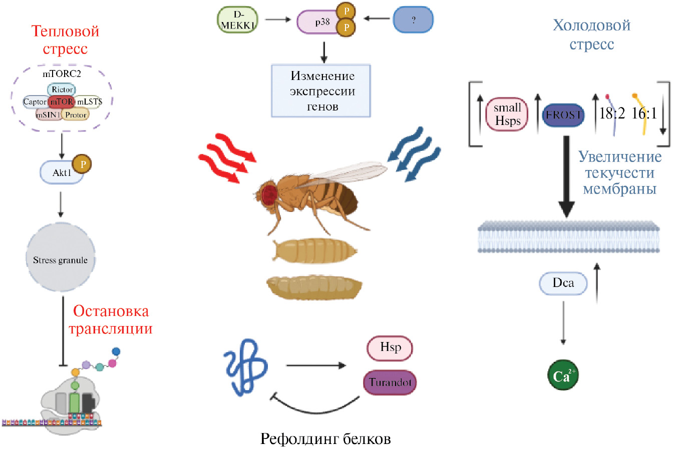 Рис. 1. Обобщающая схема механизмов ответа на температурные стрессы у D. melanogaster.