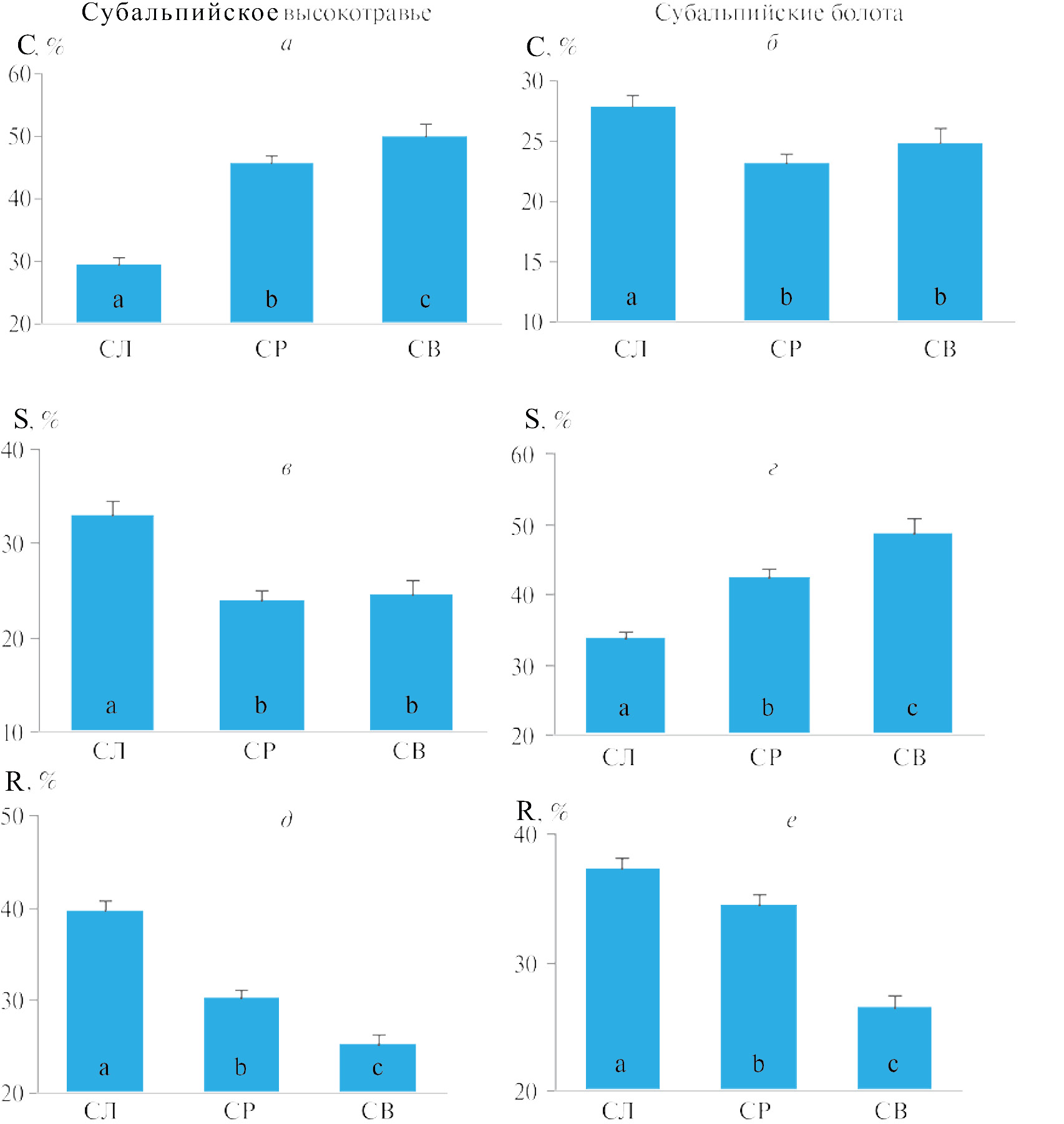 Рис. 4. Вклады CSR стратегий Грайма (а, б — конкурентности (C); в, г — стресс-толерантности (S); д, е — рудеральности (R)) для растений субальпийского высокотравья (а, в, д) и субальпийских болот (б, г, е). СЛ — случайная выборка из высокогорной флоры, СР — среднее значение по видам, встреченным на площадках без учета участия, СВ — средневзвешенное по видам с учетом надземной массы растений, n = 100. Вертикальный отрезок показывает ошибку среднего. Значимость различий по критерию Вилкоксона для сопряженных пар отмечена буквами — непересекающиеся буквы показывают отличия на уровне значимости p < 0.05.