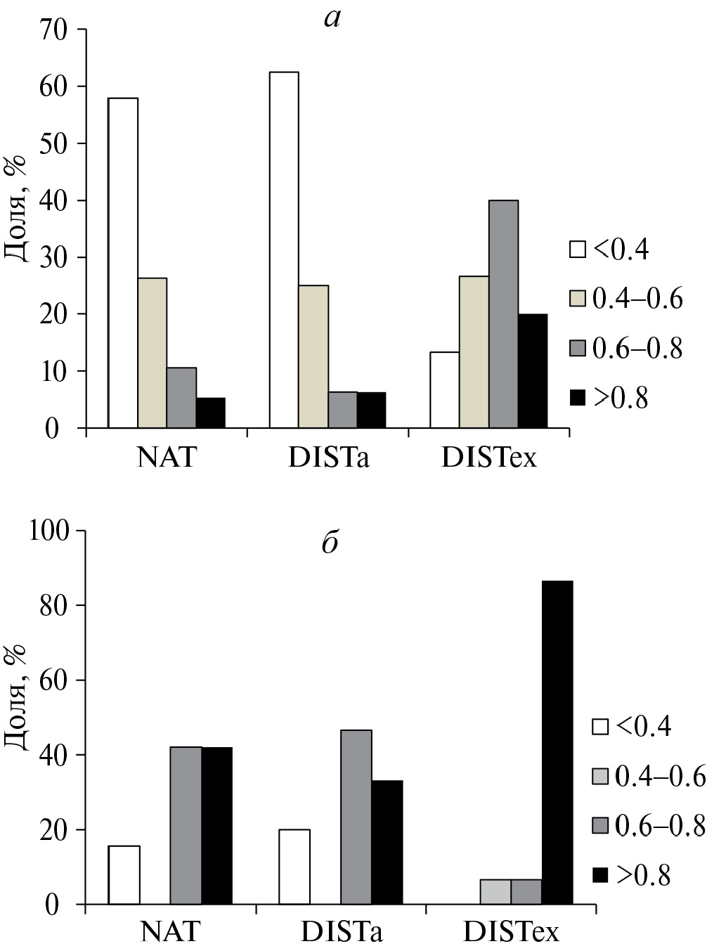 Учитывая, что характер и теснота связи между D и WG в среднем отличаются в NAT, DISTa и DISTex сообществах, можно было бы ожидать, что в среднем будут отличаться и значения THR1 и THR2. Так, в NAT сообществах они в среднем должны были бы быть наиболее низкими, в DISTex сообществах — наиболее высокими. Это предположение подтвердилось, но не полностью. Средние значения THR1 для сообществ этих типов составили 0.33 ± 0.06 (n = 19), 0.30 ± 0.06 (n = 16) и 0.60 ± 0.06 (n = 16) (F3.2 = 6.78, P < 0.05); THR2 — 0.71 ± 0.05, 0.66 ± 0.07 и 0.86 ± 0.02 (F3.2 = 3.46, P < 0.05). То есть в NAT и DISTa сообществах средние значения THR1 и THR2 оказались близкими. При этом существенно более высокими значениями порогов обоих типов характеризуются синантропные сообщества с доминированием чужеродных видов (рис. 5).