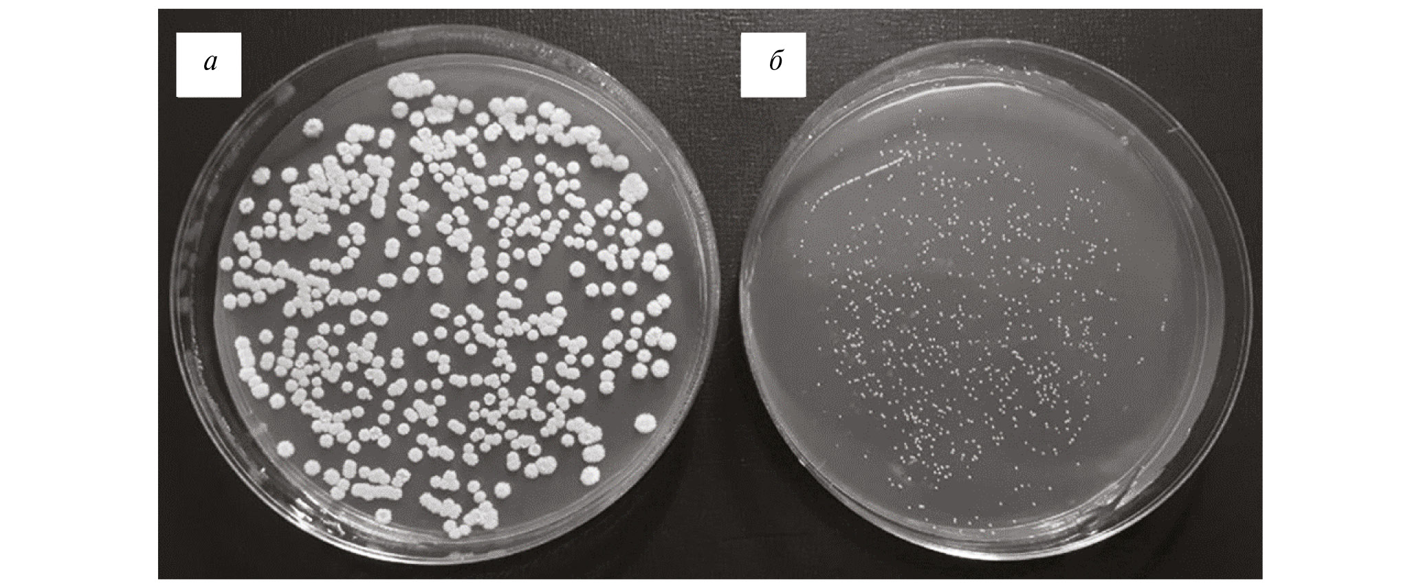 Предварительный посев. Посевы мух из линий Мн и Мбд на дрожжевую микробиоту перед началом тестирования на ПЖ и плодовитость носили качественный характер. Основная задача данного посева состояла в том, чтобы убедиться, что у контрольной линии Мн дрожжевая микробиота присутствует, а с мух Мбд, содержащихся продолжительное время на корме с антимикотическим препаратом, дрожжевая микробиота не высевается. Данная гипотеза подтвердилась. На рис. 2а представлен пример посева гомогената мух Мн, на котором обнаружено большое количество дрожжей. Впоследствии при контрольном посеве (см. ниже) дрожжевое сообщество линии Мн, живущей на корме Н, было определено – оно полностью состоит из типичного для дрозофил вида Pichia occidentalis. На рис. 2б для сравнения приведен пример посева мух Мбд, на нем обнаружены только колонии бактерий, устойчивых к используемой в работе концентрации левомицетина. Результат воспроизвелся во всех повторностях посева.