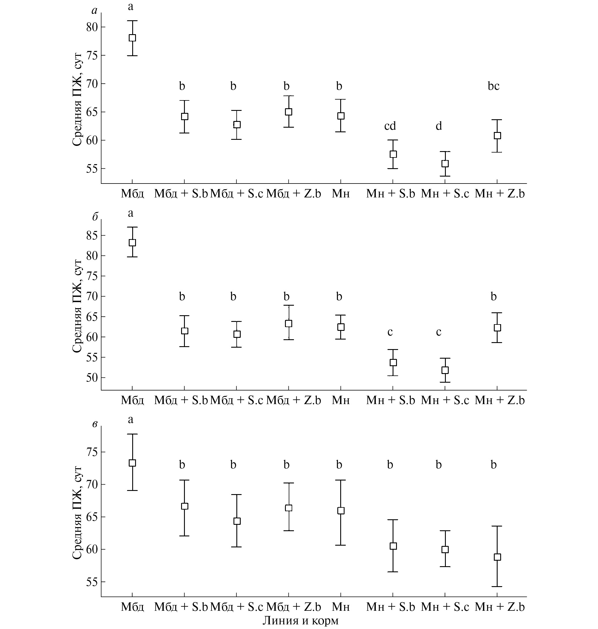 Рис. 3. Средняя ПЖ (сут) мух а) обоих полов, б) самцов, в) самок линий Мн и Мбд на корме Н без подсева или на корме Н с подсевом дрожжей S.b – S. bacillaris, S.c – S. cerevisiae, Z.b – Z. bailii. 95%-ный доверительный интервал, построенный методом бутстрэппинга. Различные буквы означают достоверные различия на 5%-ном уровне значимости.