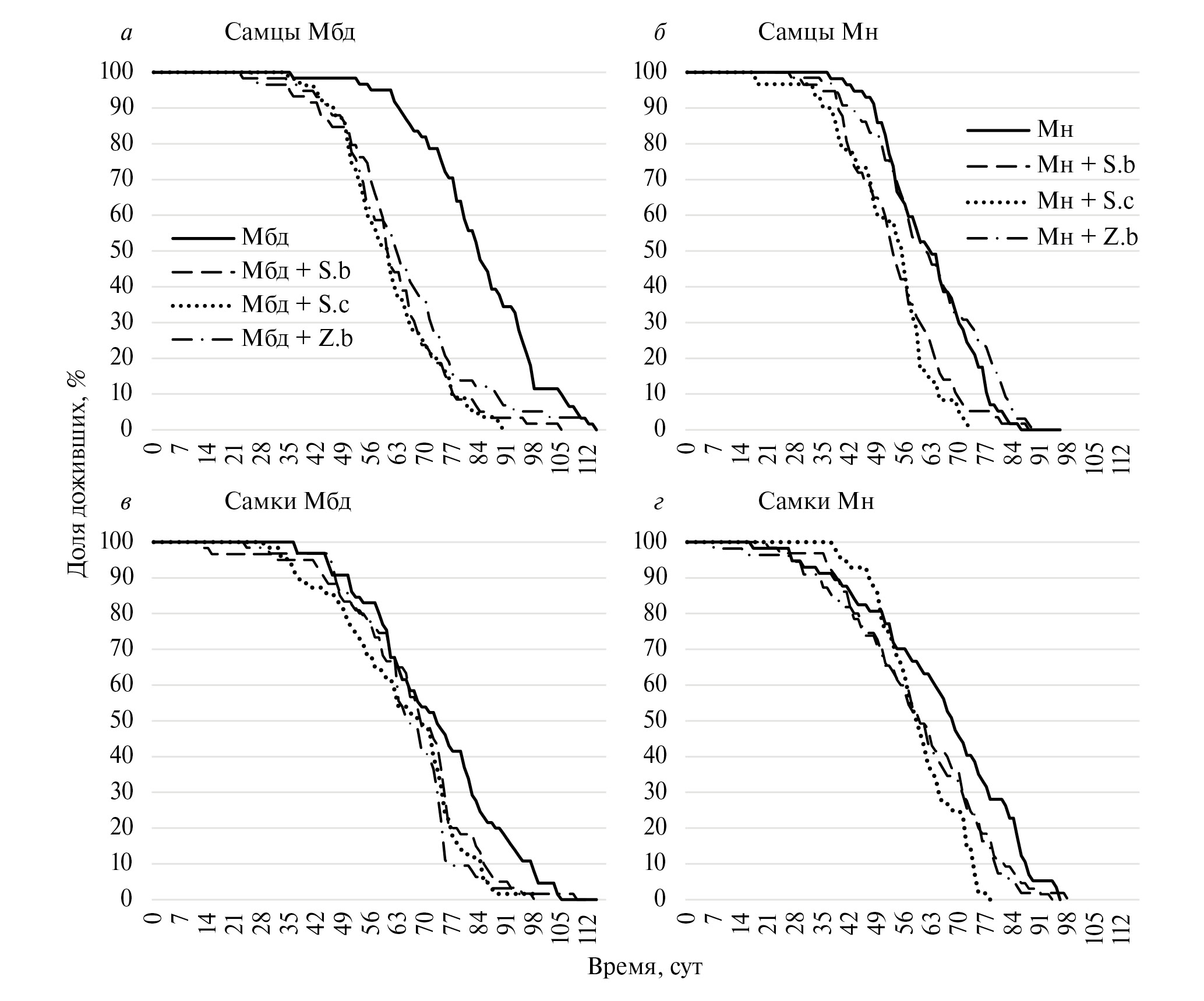 Рис. 4. Кривые выживания экспериментальных линий: а – самцы Мбд, б – самцы Мн, в – самки Мбд, г – самки Мн. По горизонтальной оси – возраст когорты, сут; по вертикальной – доля выживших мух, %. Обозначения подсевов аналогичны рис. 3.
