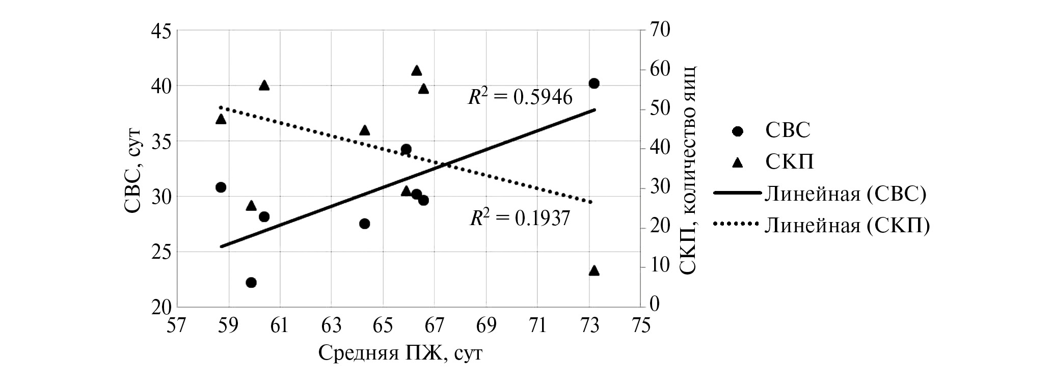 Поиск значимых взаимосвязей между средней ПЖ, СВС и СКП проведен путем парных линейных регрессий.