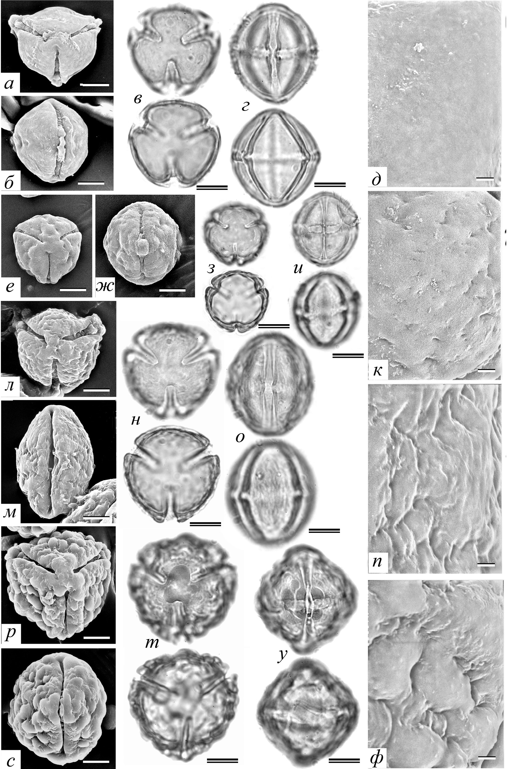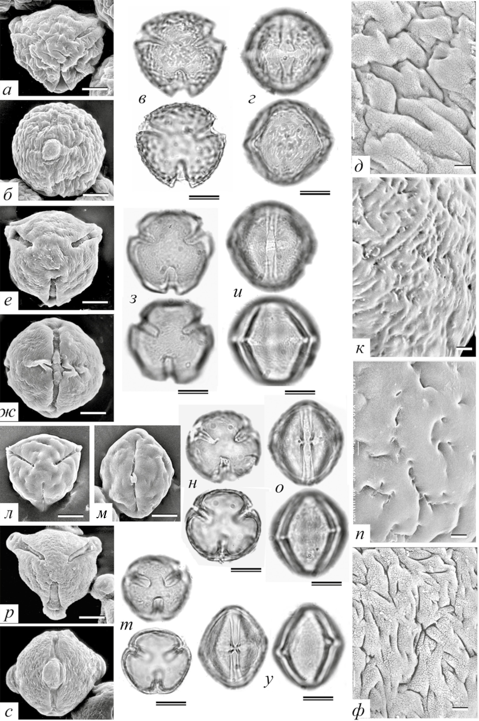 а, в, е, з, л, н, р, т — вид пыльцевого зерна с полюса; б, г, ж, и, м, о, с, у — вид пыльцевого зерна с экватора; д, к, п, ф — скульптура поверхности. а, б, д, е, ж, к, л, м, п, р, с, ф — СЭМ; в, г, з, и, н, о, т, у — СМ. Для каждого пыльцевого зерна (CМ) показан верхний и нижний фокус. Масштабные линейки: а–г, е–и, ж–о, з–у — 10 мкм; д, к, п, ф — 1 мкм.