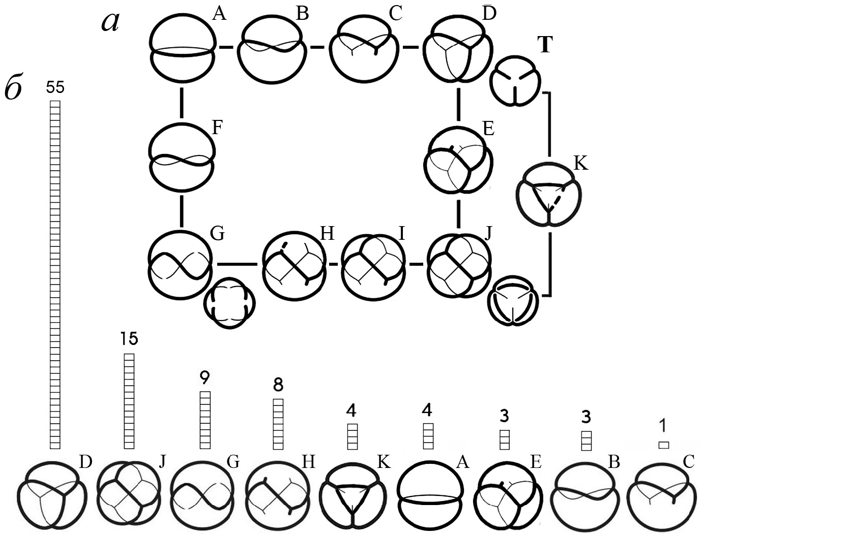 Рис. 6. Схематическое изображение форм расположения экзоапертур пыльцы представителей р. Cestrum; морфологический ряд (а) и распределение встречаемости форм пыльцы по числу видов р. Cestrum (б – высотой столбцов и цифрами у каждой формы на диаграмме указано число видов, в котором обнаружена обозначенная форма). А — циклоапертурная форма, с кольцевой апертурой, лежащей в плоскости экватора пыльцевого зерна; D — 3-кольпатная форма (типичная); G — циклоапертурная форма, с одной кольцевой апертурой, закрученной как шов на теннисном мяче (уменьшенное изображение внизу справа — 4-кольпатная форма с четырьмя W-образно попарно скошенными кольпами); J — 6-ругатная тетраэдр-форма; К — 3-кольпатная форма с парасинкольпом на одном из полюсов; B, C, F, E, H, I — промежуточные формы. Уменьшенные изображения внизу справа от форм D, G и J показывают эту же форму в другой проекции.
