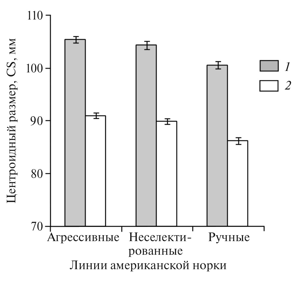 Рис. 2. Сравнение средних центроидных размеров CS (с учетом стандартных ошибок ±SE) между самцами (1) и самками (2) линий агрессивных, неселектированных и ручных клеточных американских норок.
