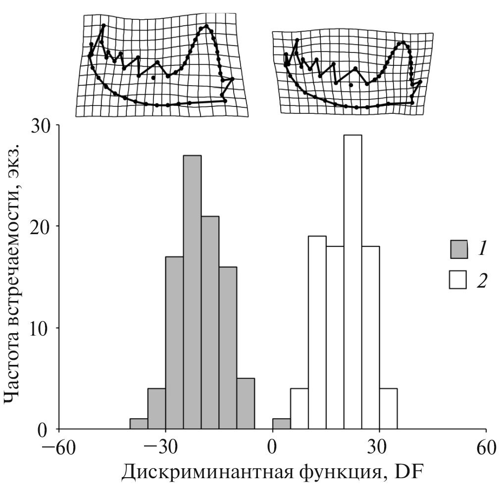 Рис. 3. Итоги линейного дискриминантного анализа (LDA) прокрустовых координат, характеризующих изменчивость формы нижней челюсти в выборках самцов (1) и самок (2) американской норки без учета принадлежности к линии. Контурные конфигурации мандибул (outlines), встроенные в сплайны деформационных решеток соответствуют гистограммам распределений сравниваемых выборок.