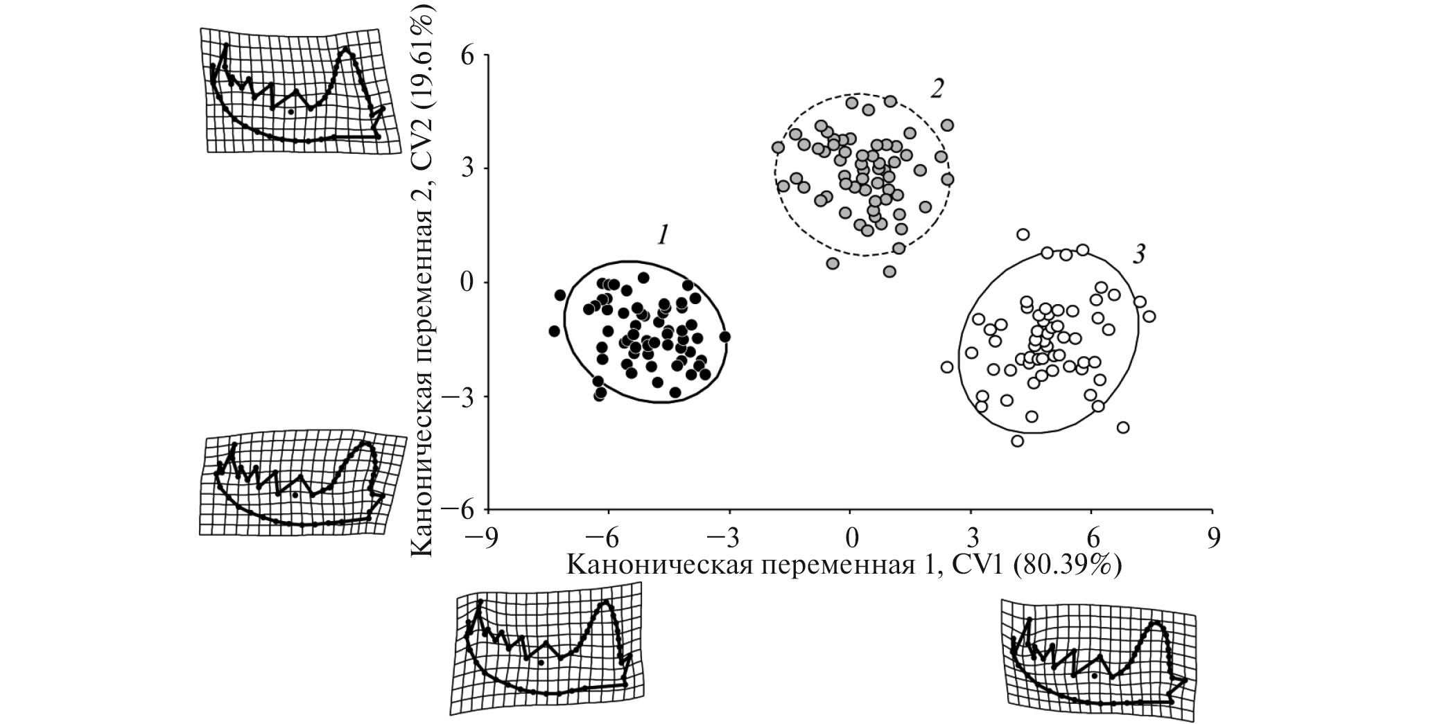 Рис. 4. Результаты канонического анализа (CVA) прокрустовых координат, характеризующих изменчивость формы нижней челюсти линий агрессивных (1), неселектированных (2) и ручных (3) американских норок. Контурные конфигурации мандибул (outlines) соответствуют минимальным и максимальным значениям ординат вдоль канонических переменных на этом и последующих рисунках (коэффициент преувеличения (exaggeration coefficient) – 3.0).