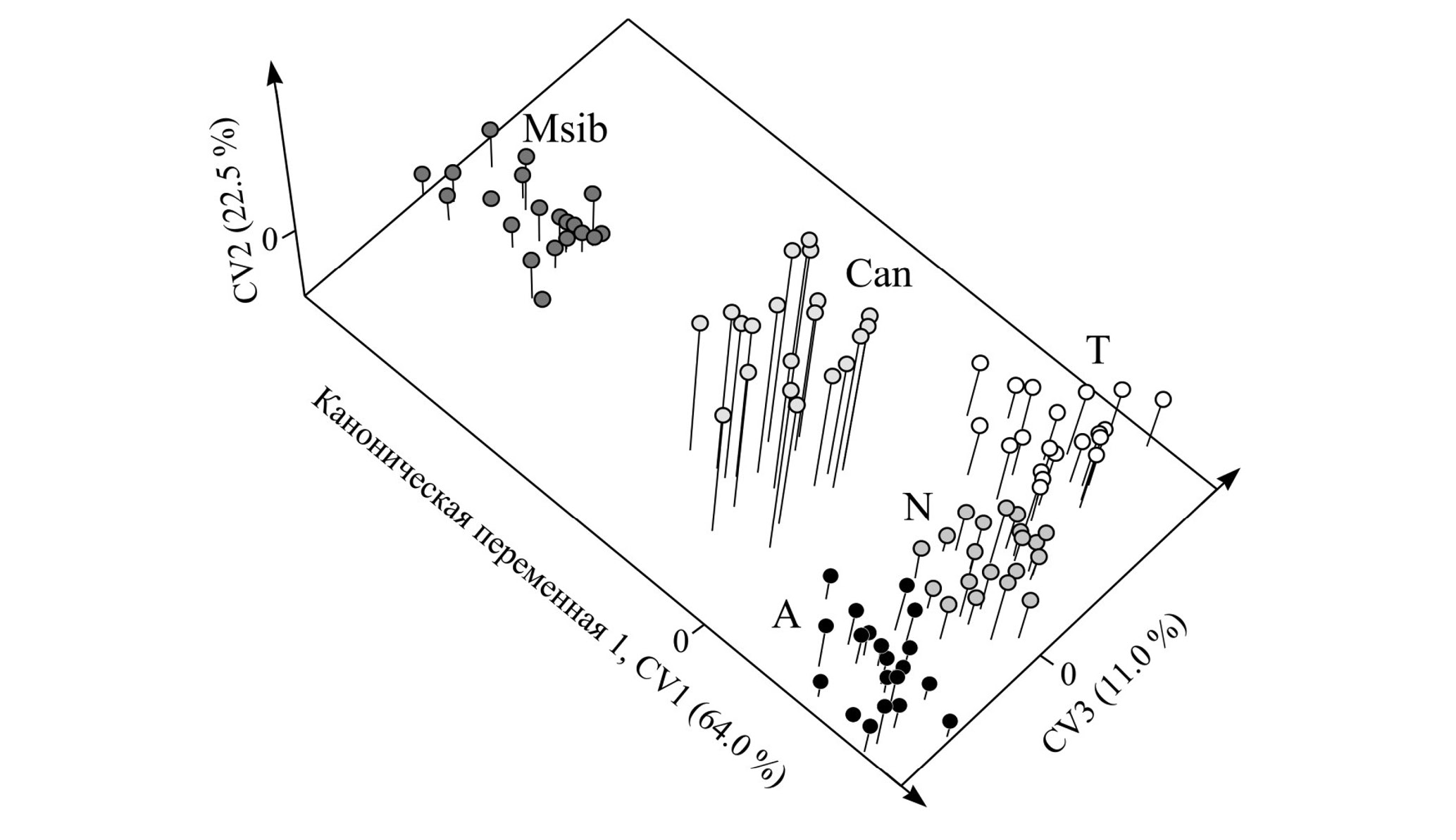 При оценке “эволюционной значимости” морфологических различий между линиями селектированных клеточных норок необходимо было соотнести их также с размахом заведомо межвидовых различий. Для сравнения с американской норкой использовали серии мандибул сходных по возрасту взрослых самцов другого вида – колонка Mustela sibirica (Mustelidae: Carnivora) (n = 20). Материал добыт охотниками на Среднем Урале и передан в музей ИЭРиЖ УрО РАН в 50–60-х годах прошлого века. Сравнение клеточных самцов трех линий с самцами диких американских норок из Канады и самцами другого вида при случайном выравнивании всех выборок по числу наблюдений (n = 20) дает возможность корректно оценить относительный размах внутривидовой дифференциации линий N. vison относительно дивергенции от M. sibirica.