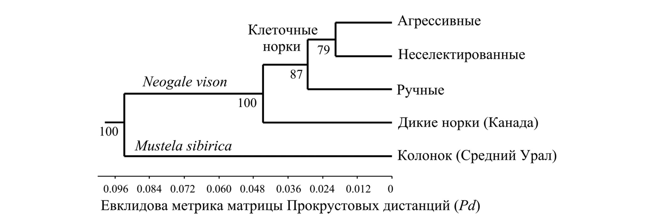 Проведенное сравнение позволяет соотнести размах морфологических изменений, возникших после селекции и оцениваемых различиями между линией неселектированных (контрольных) и обеими линиями экспериментальных клеточных американских норок, с морфологическими различиями между клеточными и дикими, а также заведомо межвидовыми различиями. Степень морфогенетических изменений, проявившихся у американской норки в ответ на селекцию по признакам оборонительного поведения в целом существенно меньше, чем уровень ее дивергенции от колонка, но превышает половые различия и сопоставима со степенью внутривидовой дифференциации между клеточными и дикими особями. Поэтому можно сделать вывод о существенном изменении морфогенеза мандибул клеточных американских норок в условиях зверофермы. Таким образом, морфогенетические эффекты, возникшие в итоге селекции американской норки по признакам оборонительного поведения, демонстрируют высокий адаптационный и эволюционный потенциалы этого вида. Выявленная фенотипическая пластичность линий при селекции по признакам оборонительного поведения свидетельствует о возможности быстрой выработки адаптаций в локальных популяциях американской норки как инвазивного вида при освоении новых биотопов и расширении ареала.