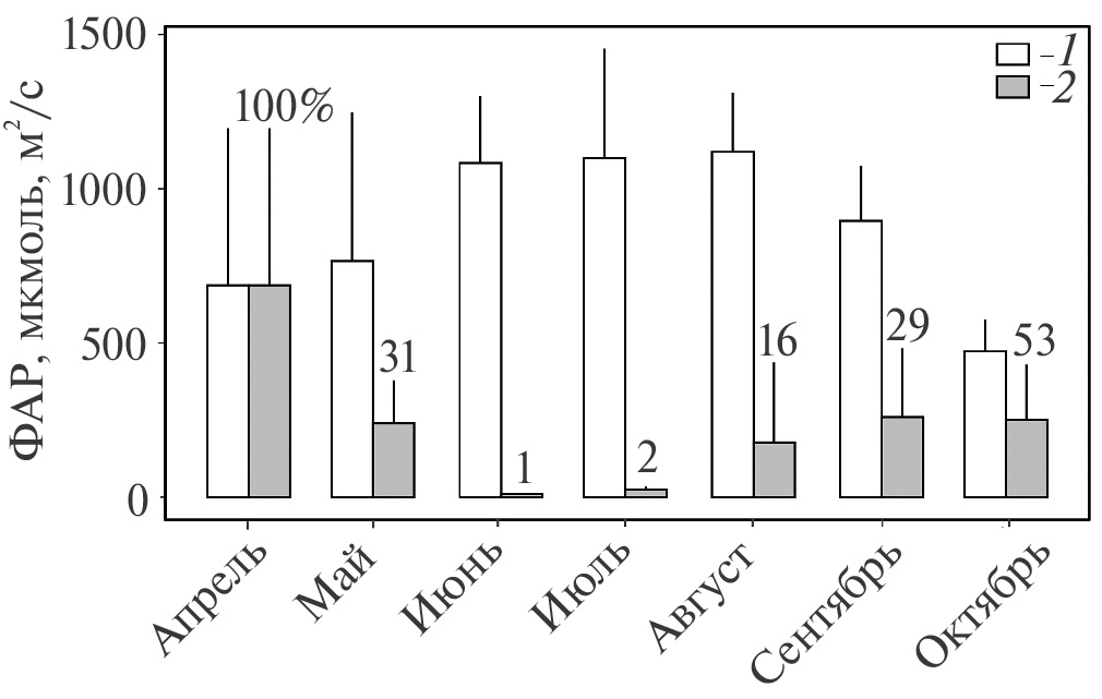 Рис. 2. Сезонная динамика поступления фотосинтетически активной радиации (ФАР) к растениям H. mantegazzianum. 1 – интенсивность ФАР на высоте 250 см над поверхностью почвы, 2 – интенсивность ФАР на высоте 10–15 см над поверхностью почвы. Приведено среднее значение со стандартным отклонением, цифрами (%) указана доля светового потока, проникающего в приземный слой, от общего поступления ФАР.