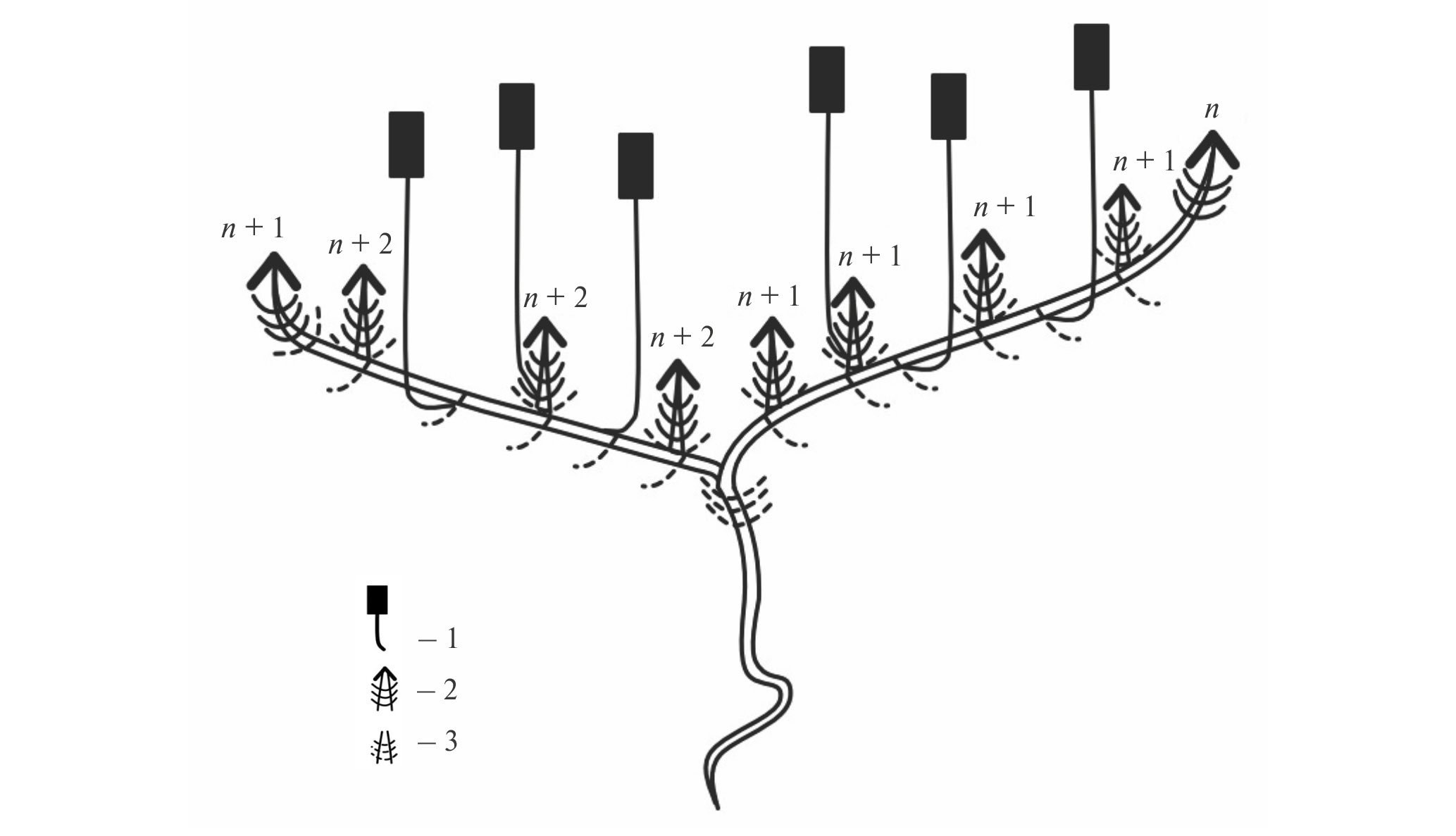 Рис. 1. Схема строения побегов C. аrctica: 1 – монокарпический побег; 2 – облиственный побег розеточного типа; 3 – побег розеточного типа с отмершими листьями. n, n + 1, n + 2 – порядок ветвления осей побега.