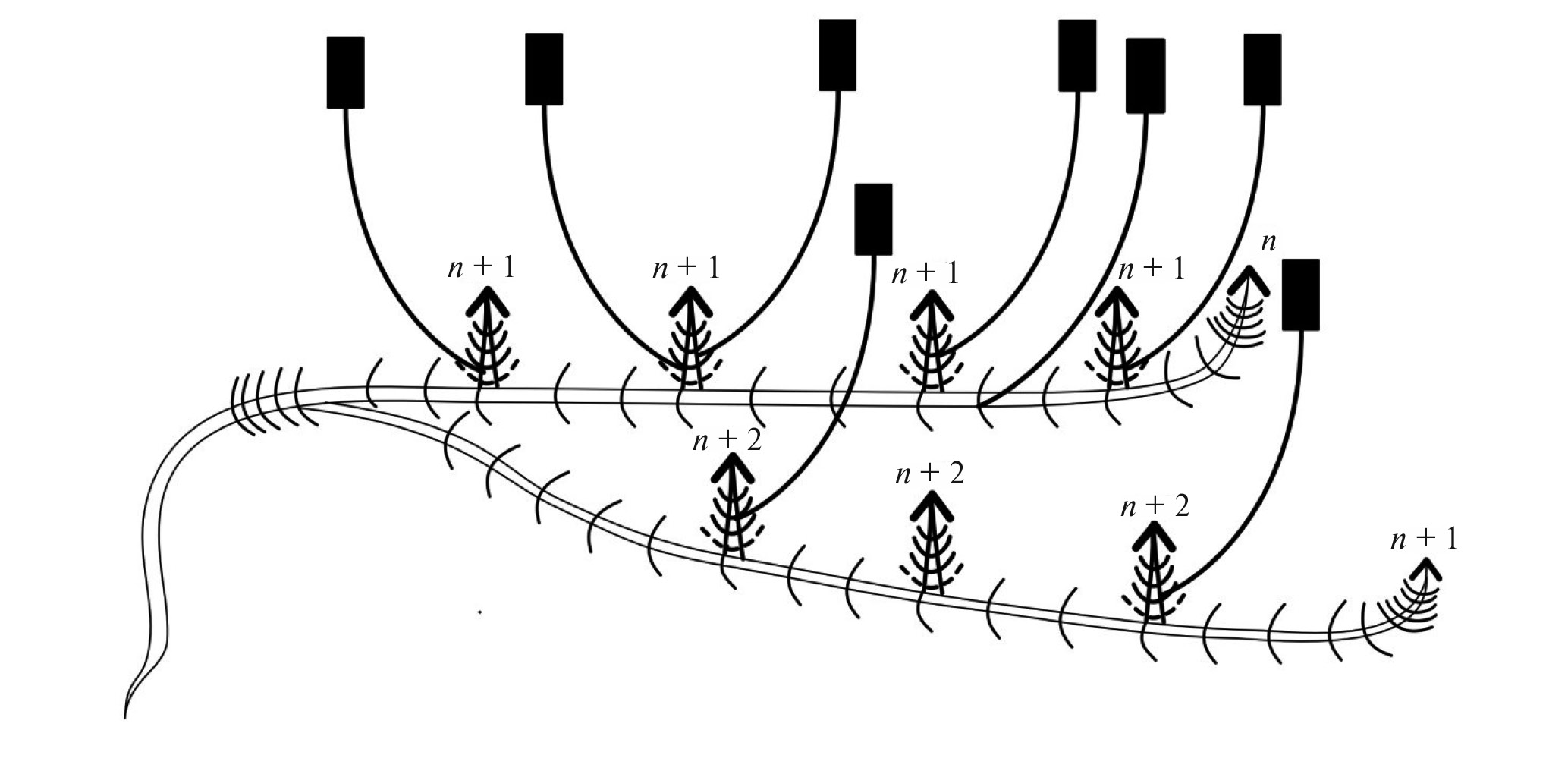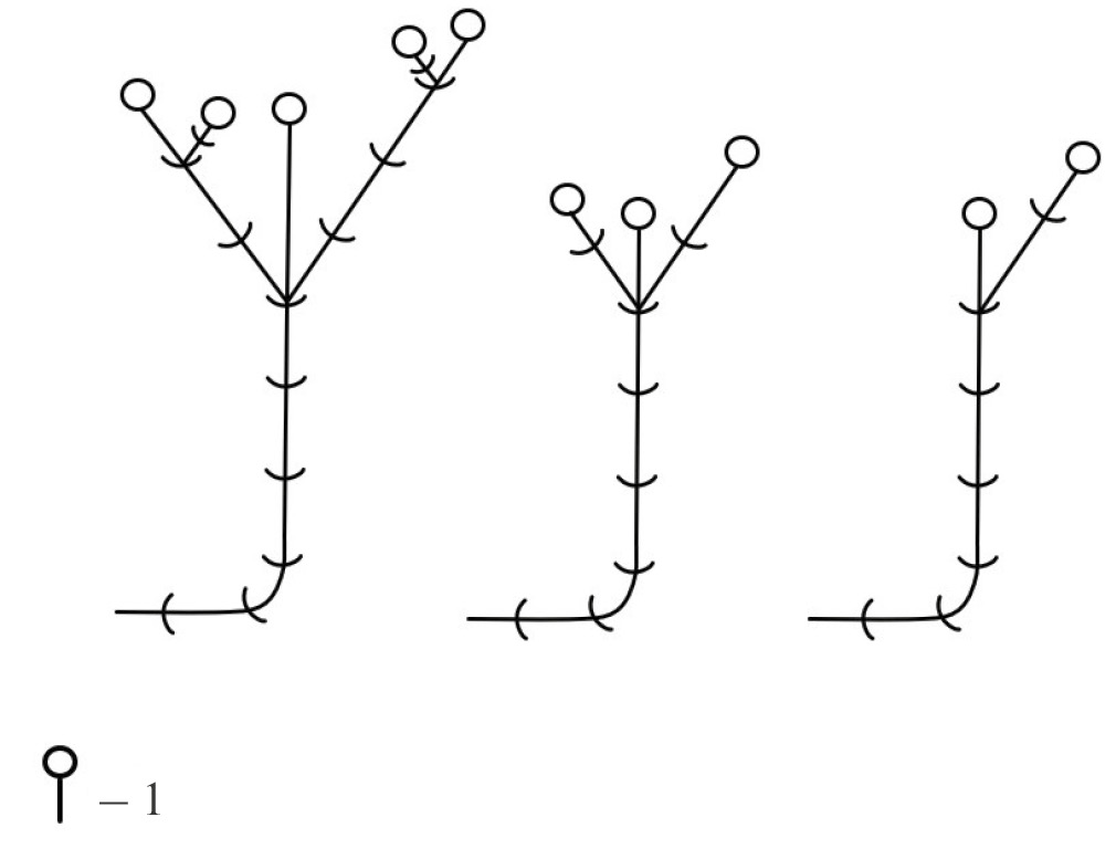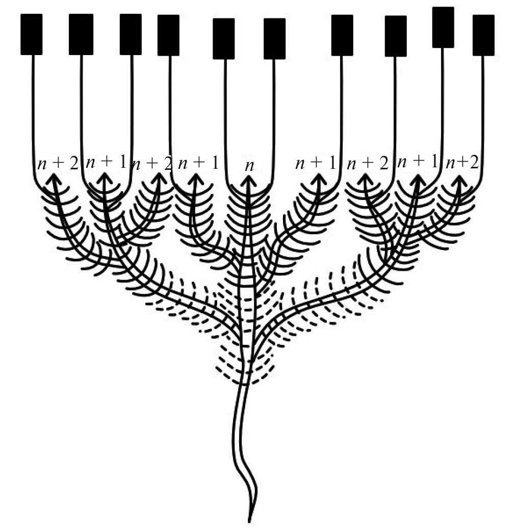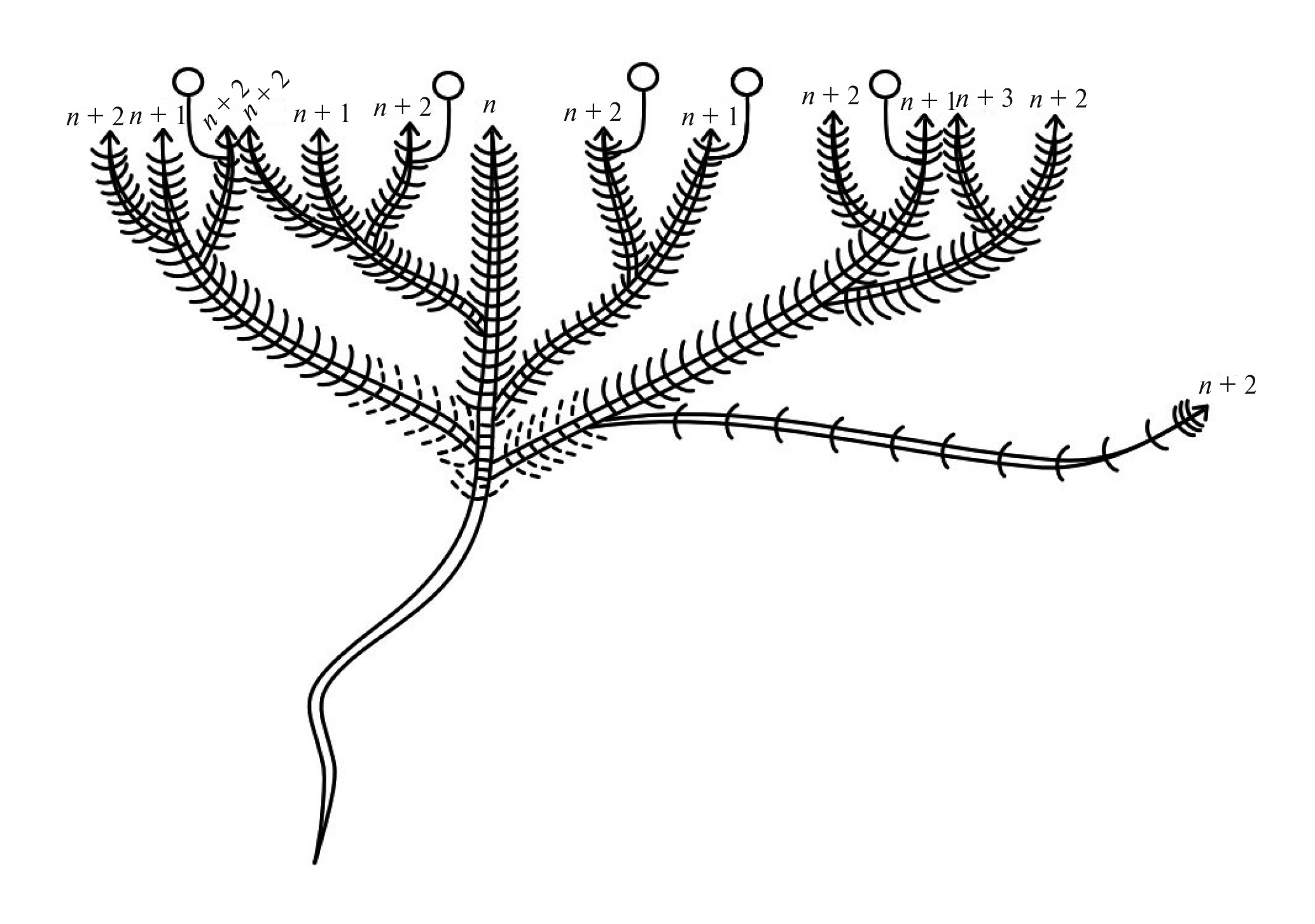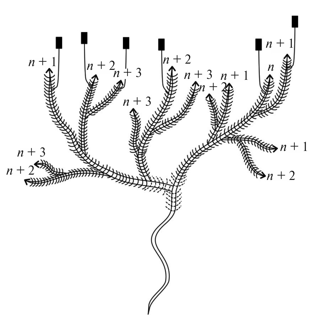 С. doerfleri. Растение в процессе развития образует плотную подушку, состоящую из густо олиственных побегов. Отмершие листья сохраняются на стеблях в основании побегов. Нарастание моноподиальное, однако на ранних этапах онтогенеза из пазушных почек на побеге первого порядка (n) появляются побеги второго порядка (n + 1) с анизотропным характером роста, которые активно растут в разных направлениях, захватывая ближайшую территорию (рис. 6). С увеличением порядка ветвления побегов рост осей начинает замедляться. На осях четвертого-пятого порядков (n + 3, n + 4) вегетативное разрастание прекращается, вероятно, в связи с нехваткой пространства внутри подушки для развития дополнительных побегов. Модель побегообразования – моноподиальная розеточная с мезотонией. Развитие подушки в онтогенезе растения происходит одновременно во многих плоскостях и направлениях.