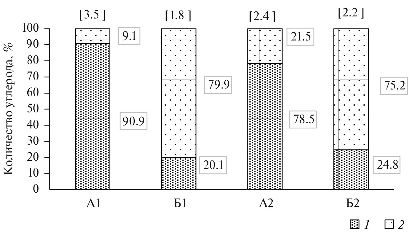 Рис. 2. Накопление углерода в продукции растений в ельниках черничном влажном (А1), долгомошно-сфагновом (А2) и на вырубках ельников черничного влажного (Б1), долгомошно-сфагнового (Б2): 1 – древесные растения, 2 – растения напочвенного покрова. Продукция углерода, т∙га⁻¹.