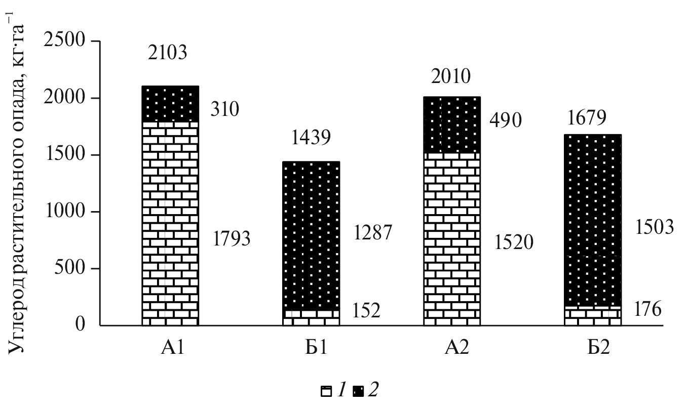 Рис. 3. Возврат углерода с опадом ОВ в ельниках черничном влажном (А1), долгомошно-сфагновом (А2) и на вырубках ельников черничного влажного (Б1), долгомошно-сфагнового (Б2): 1 – древесные растения, 2 – растения напочвенного покрова.
