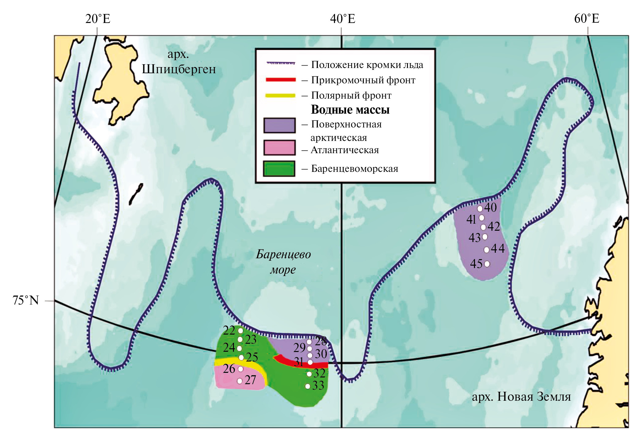 Рис. 1. Карта-схема района исследований и расположение станций отбора проб (22−33, 40−45).